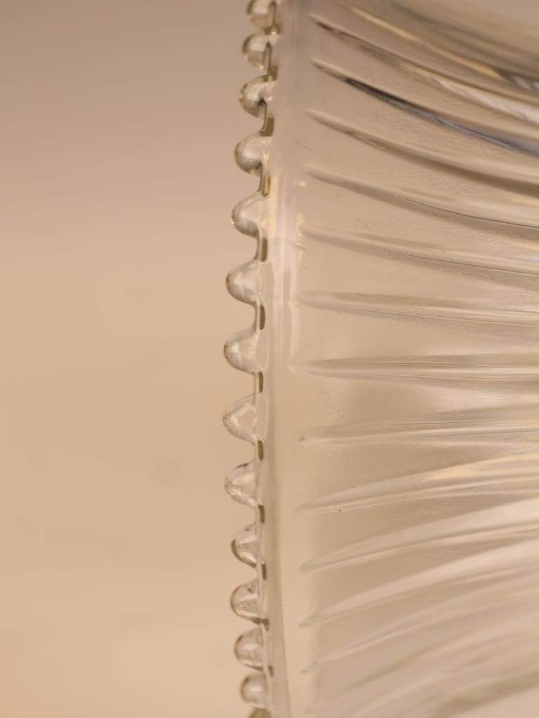 The fluted bell-shaped glass shade, with its gently beaded rim, is entirely consistent with turn-of-the-century Art Nouveau lighting, designed to diffuse light evenly and create a warm, atmospheric glow rather than sharp brilliance. The pierced brass gallery and original thumb screws further confirm its early electric origin.