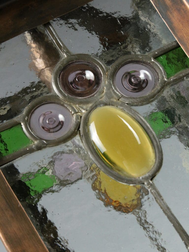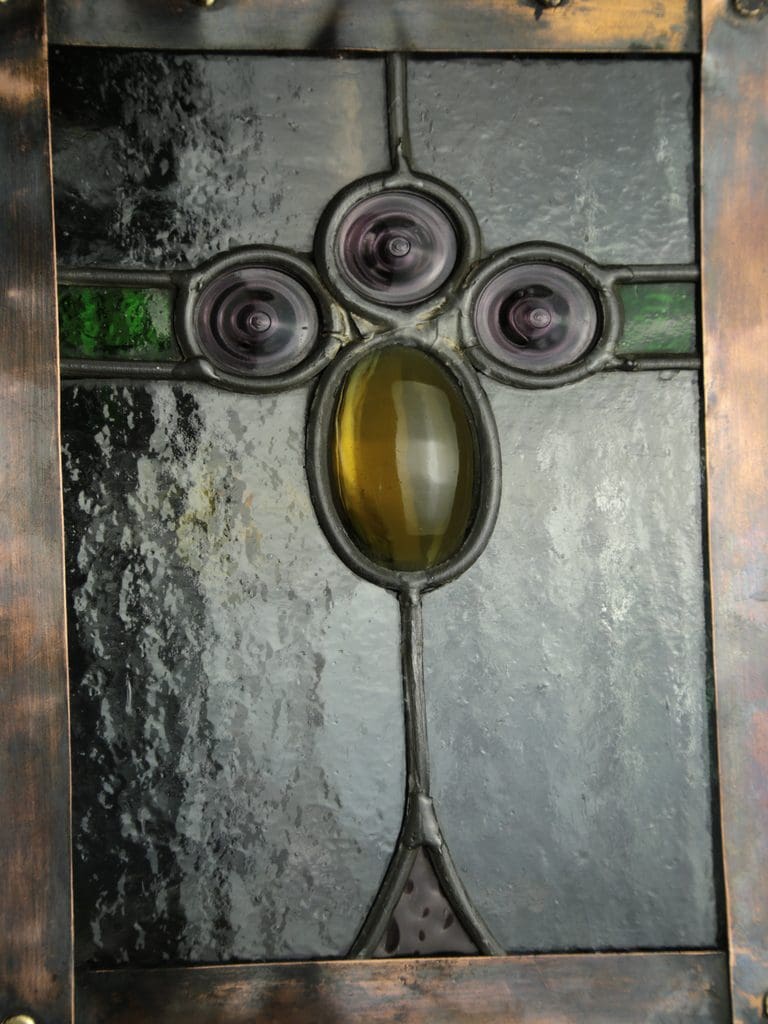 The leaded glass panels on all four sides are meticulously crafted, adding a touch of elegance. The unique patterns and textures of the glass beautifully diffuse light, creating a warm and inviting ambiance.
