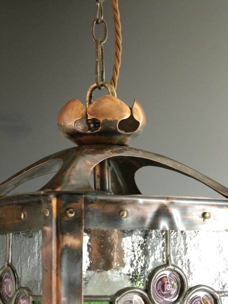 Dating from 1900, this exquisite Arts and Crafts Copper Lantern epitomizes the timeless beauty and craftsmanship synonymous with the Arts and Crafts movement. Handcrafted from high-quality copper, featuring copper rivets, an open gallery, and petal motifs at the top, the lantern boasts intricate detailing that underscores its artisanal origin.
