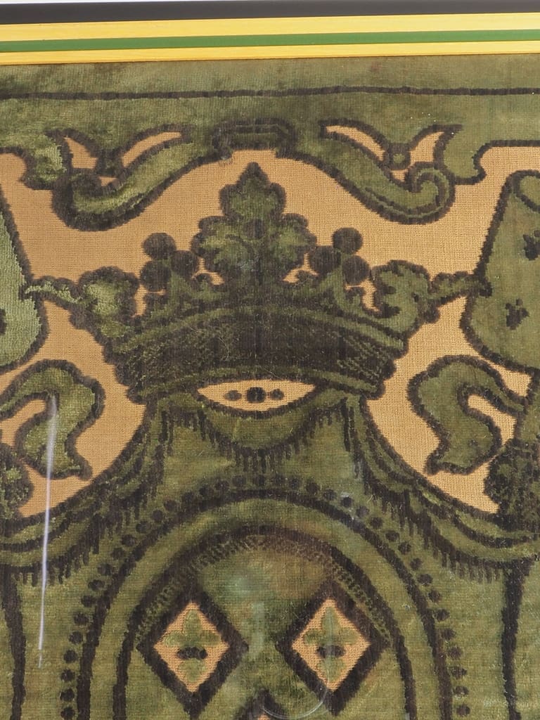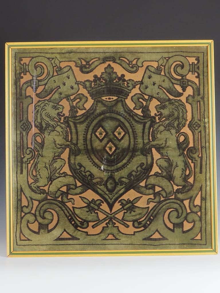 Velvet has long been cherished for its luxurious texture and rich hues, making it a preferred fabric for ceremonial and decorative purposes. During the 19th century, velvet tapestries were often used to showcase heraldic emblems, signaling nobility, lineage, or allegiance. This exquisite tapestry fragment exemplifies the opulence and craftsmanship of the era, likely serving as a decorative or commemorative piece within a prestigious setting.