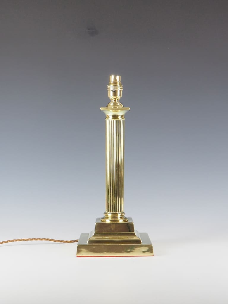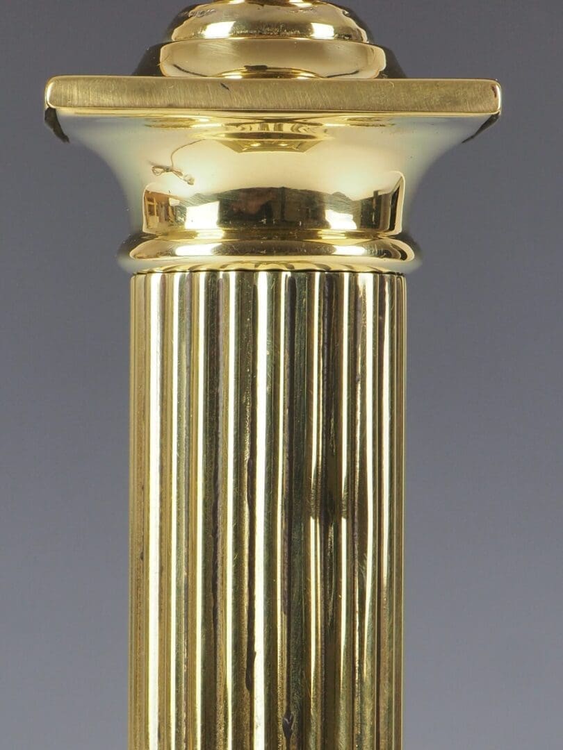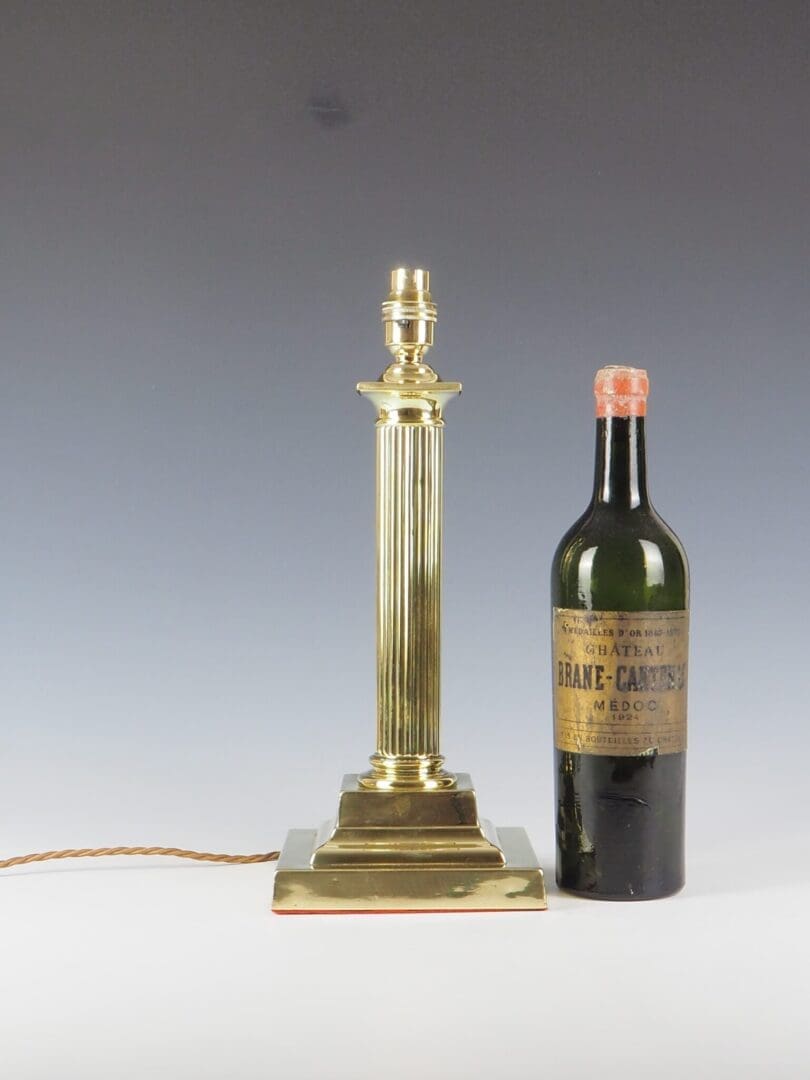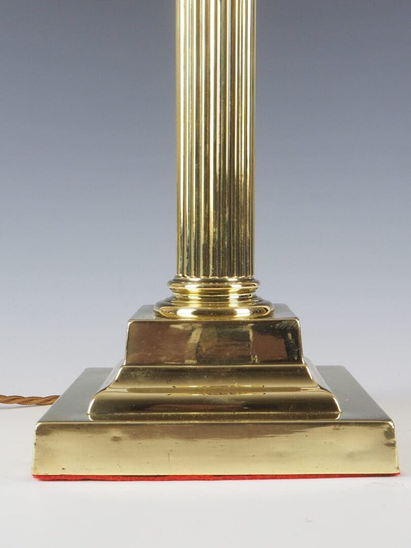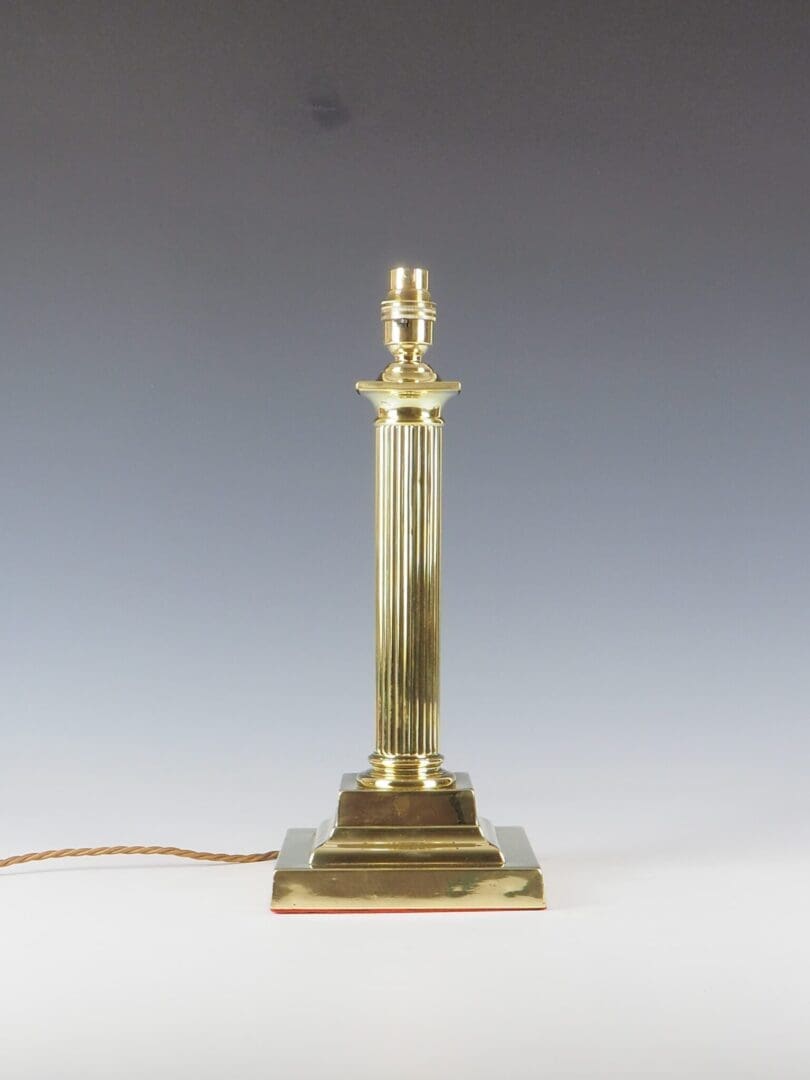 Description Antique Brass Column Table Lamp Antique Brass Column Table Lamp, dating back to around 1910, has been carfully converted to electricity while retaining its elegant and timeless design. The tapering and slender fluted shaft of the lamp further enhances its grandeur, making it a statement piece in any interior setting. Resting on a substantial and weighted stepped square base, this lamp exudes luxury with its garlands and laurel decorations, reflecting the opulence of the Victorian era. Whether displayed in a traditional Victorian-inspired decor or as a striking contrast in a contemporary setting, this elegant column table lamp is sure to captivate with its timeless beauty and exquisite craftsmanship.