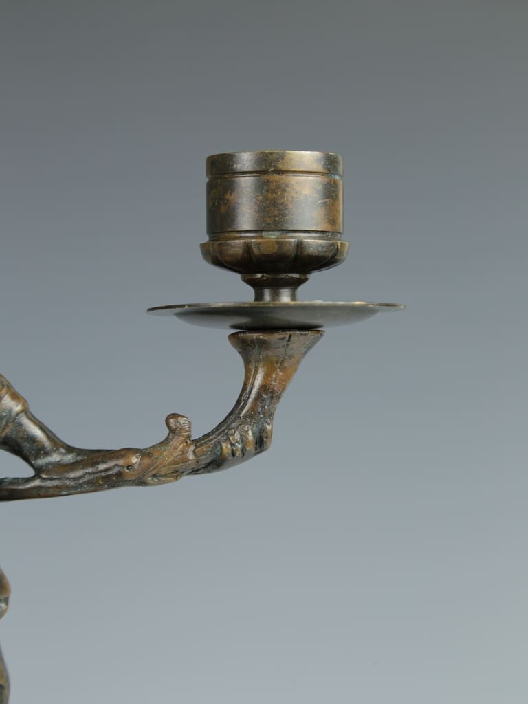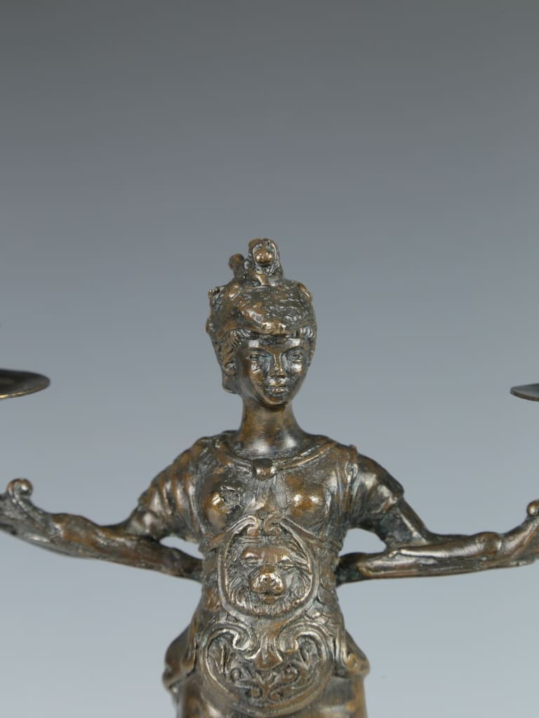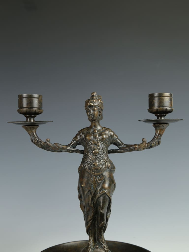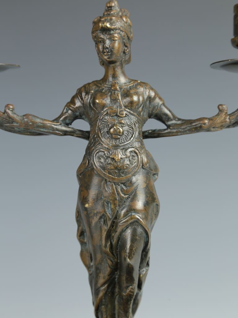 This pair of bronze Athena candelabras are in good condition, showcasing a rich dark patina that highlights its antique charm. While they could be cleaned further, it retains its original allure.