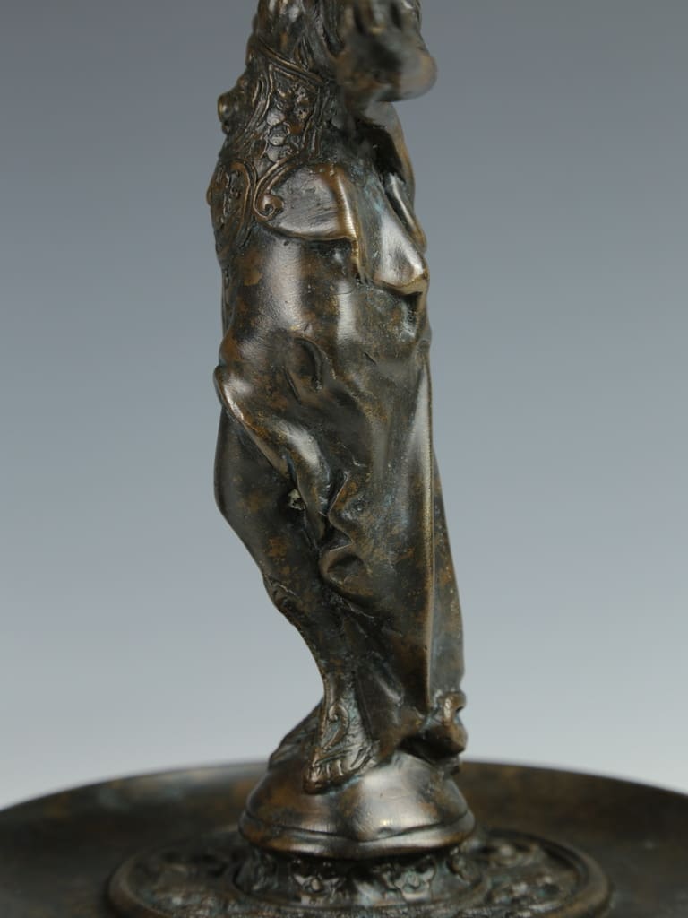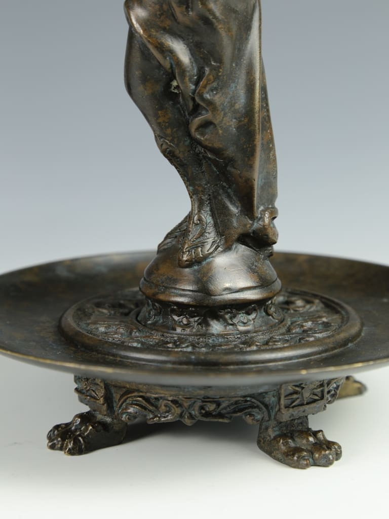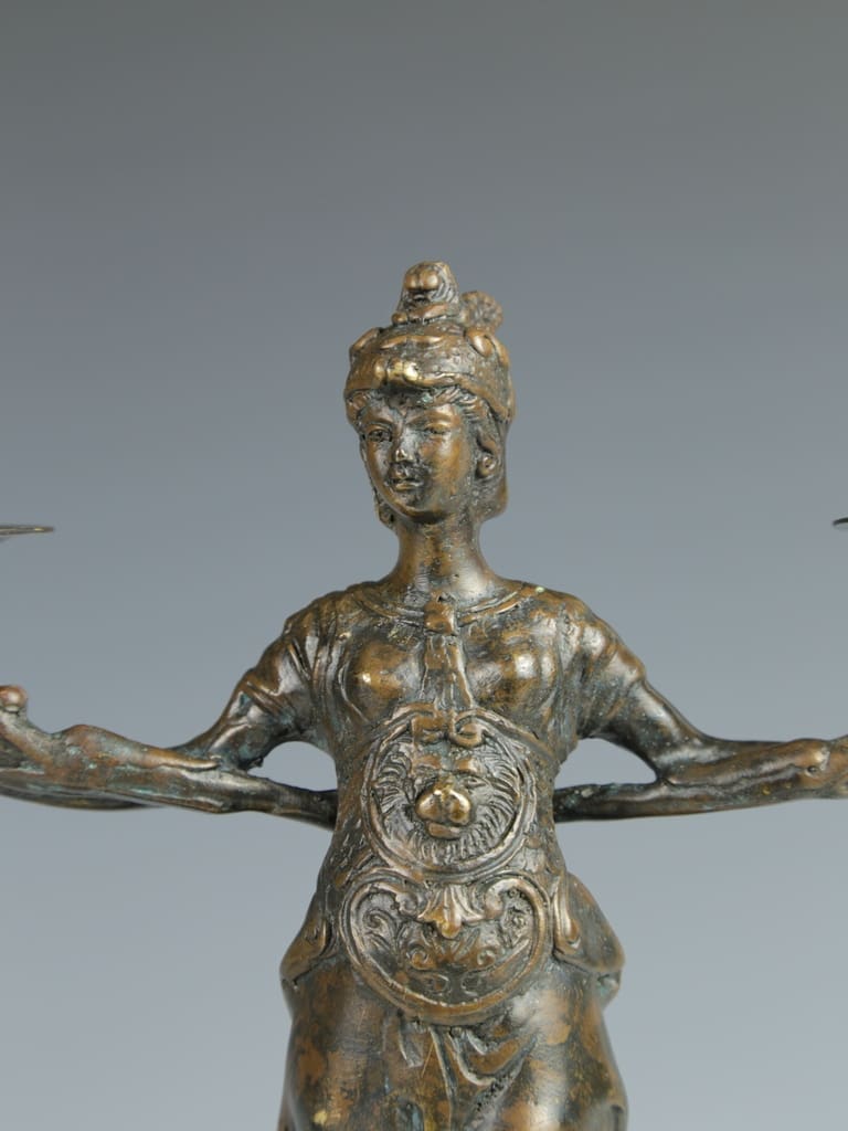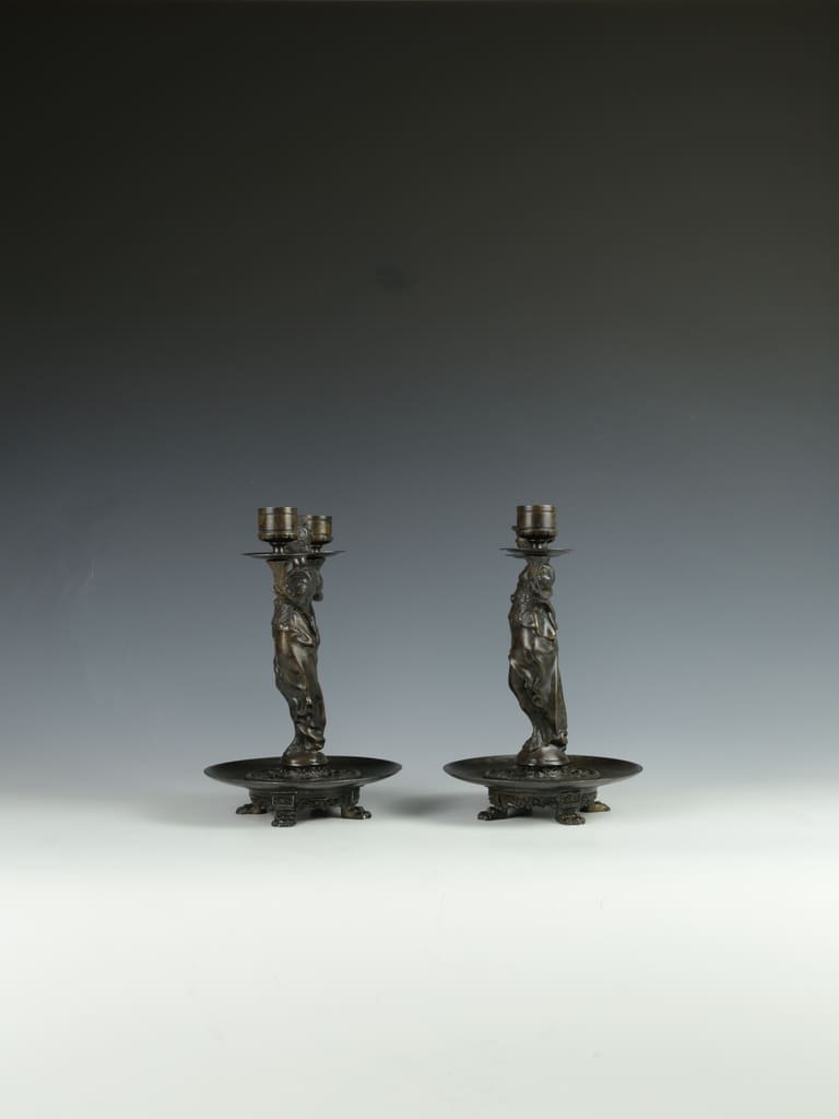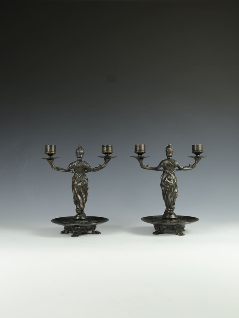 This pair of bronze Athena candelabras are in good condition, showcasing a rich dark patina that highlights its antique charm. While they could be cleaned further, it retains its original allure.