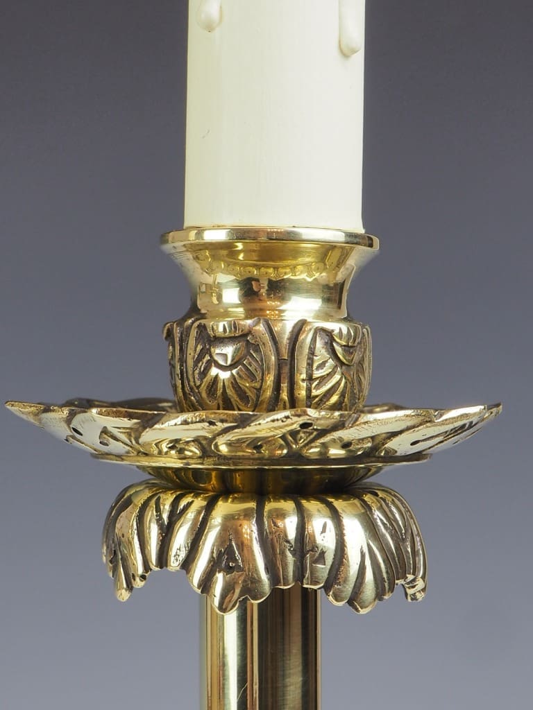 Exquisite pair of brass candlestick lamps from the 19th century showcases an elegant design that is sure to add a touch of sophistication to any space.