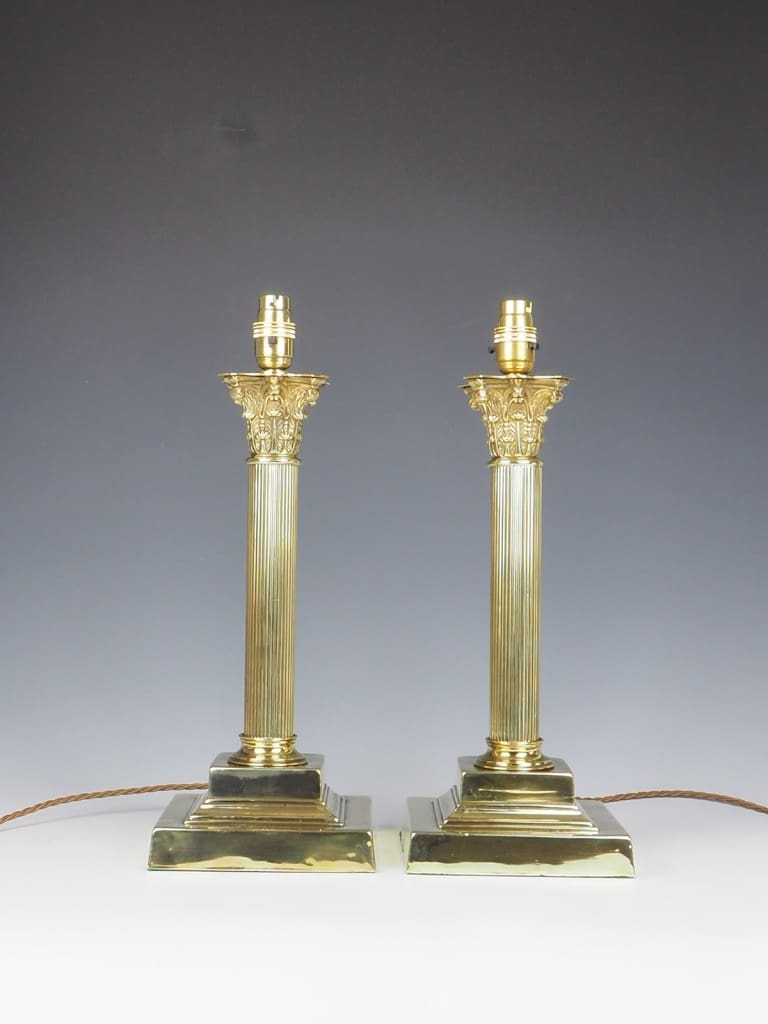 Pair of Brass Columnar Corinthian Antique Table Lamps