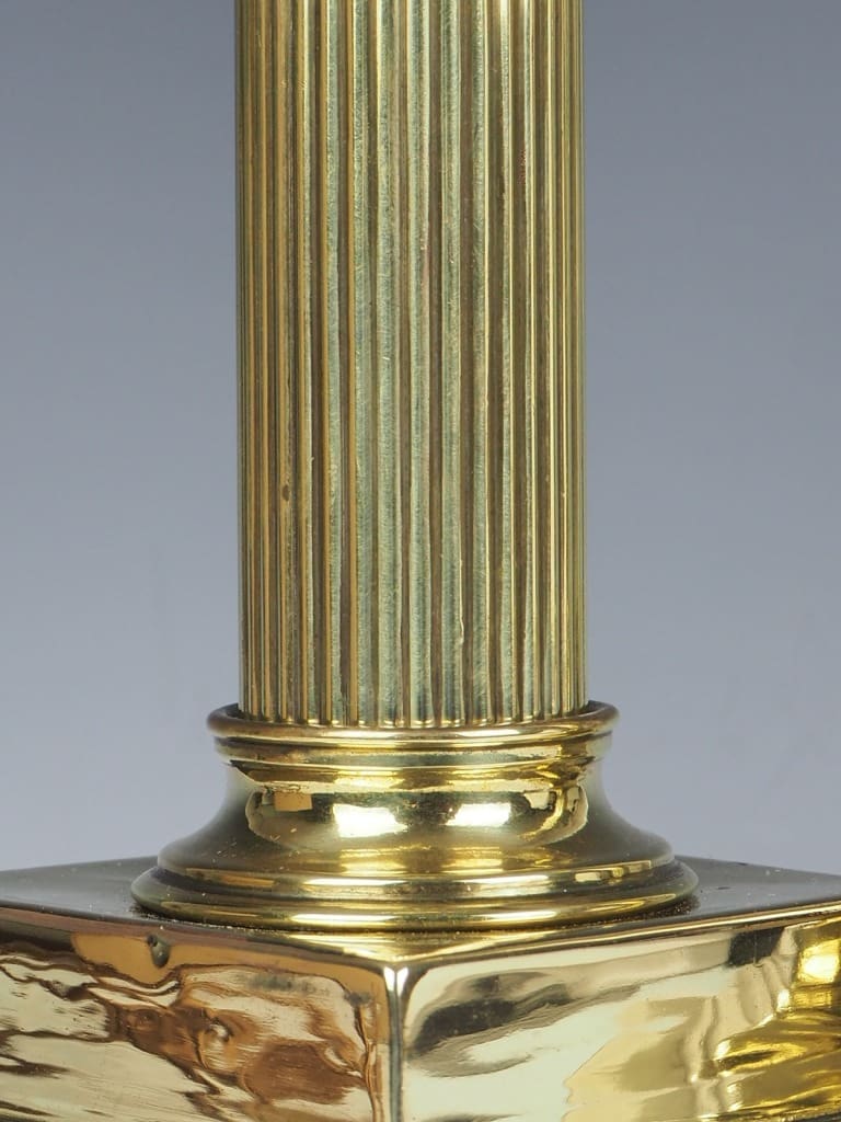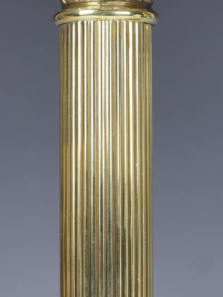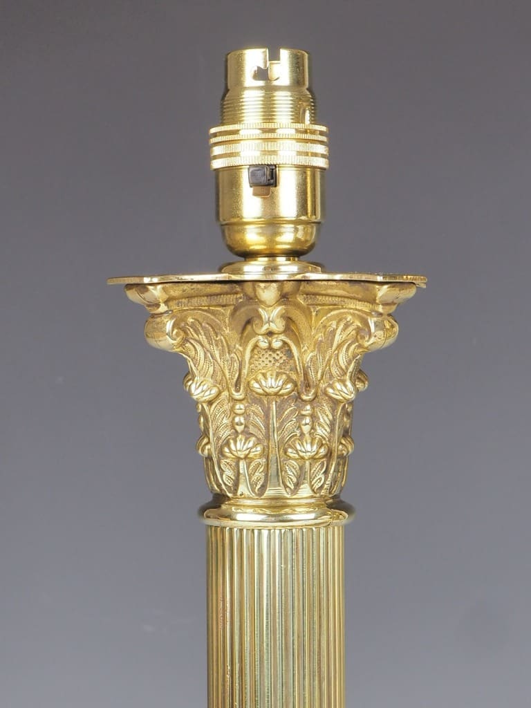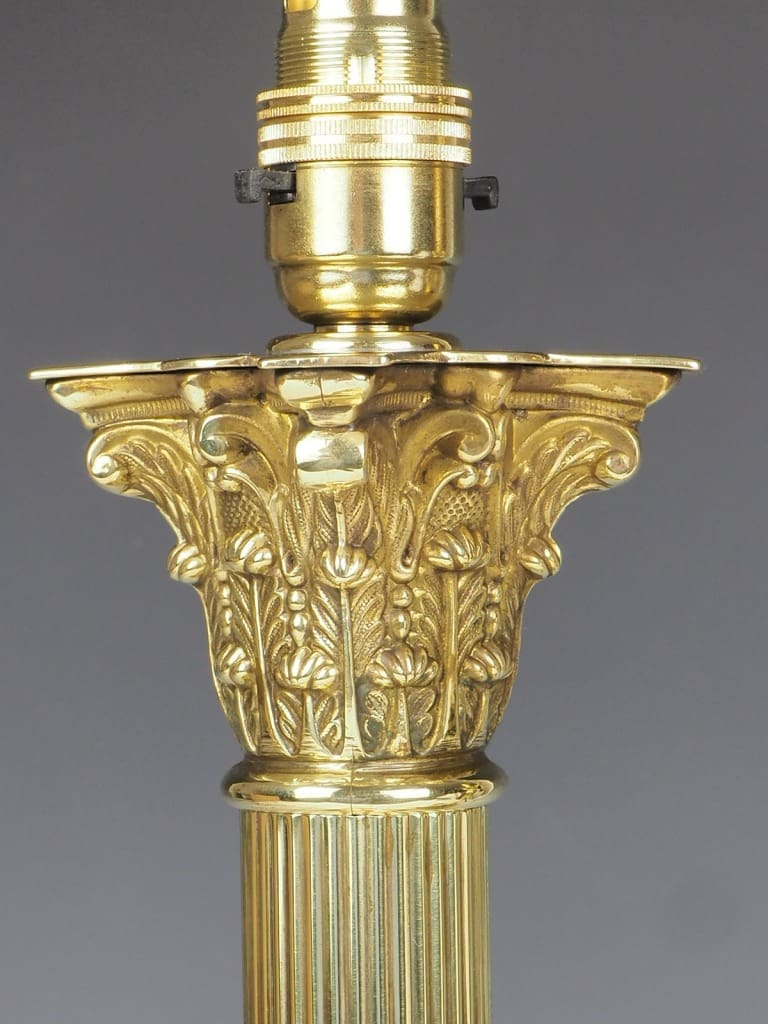 Description Pair of brass columnar Corinthian antique table lamps are a stunning representation of the opulence and grandeur of the late 19th Century. Originally designed for oil lamps, both have been expertly converted to electricity, ensuring modern functionality and convenience. These lamp's most striking feature is its Kingly Corinthian Capital, which is adorned with intricate classical ornate foliage in the form of splendid acanthus leaves. The level of detail is truly remarkable, showcasing the craftsmanship and artistry of the era.