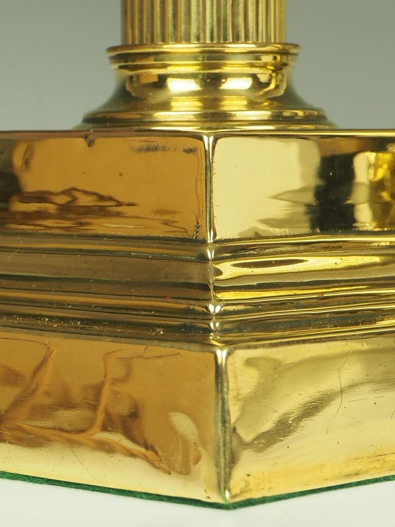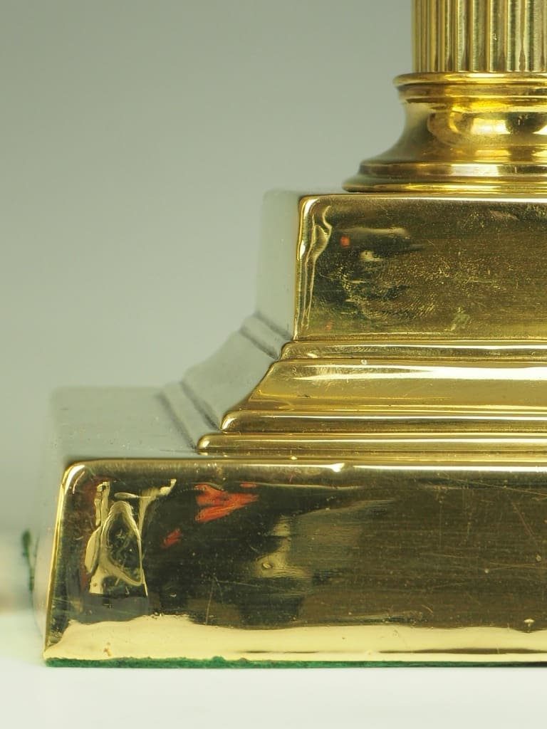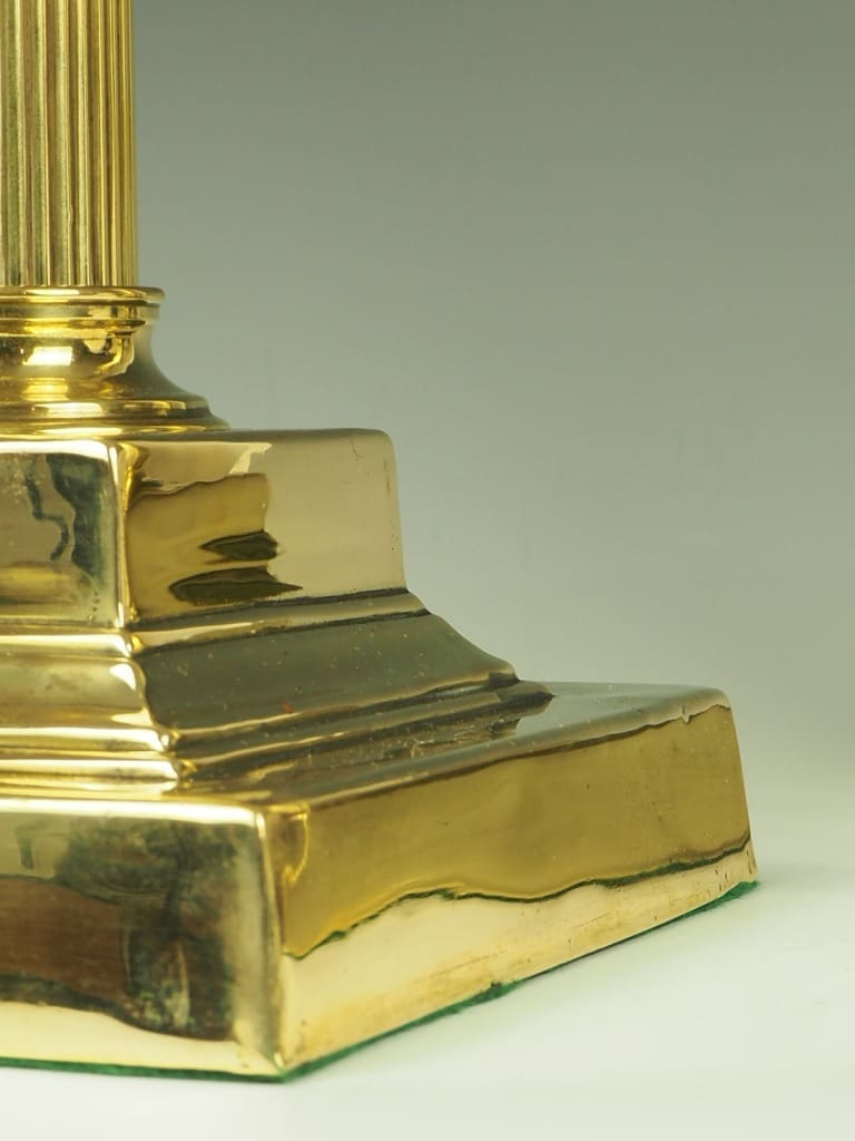 Pair of brass columnar Corinthian antique table lamps are a stunning representation of the opulence and grandeur of the late 19th Century. Originally designed for oil lamps, both have been expertly converted to electricity, ensuring modern functionality and convenience. These lamp's most striking feature is its Kingly Corinthian Capital, which is adorned with intricate classical ornate foliage in the form of splendid acanthus leaves. The level of detail is truly remarkable, showcasing the craftsmanship and artistry of the era.