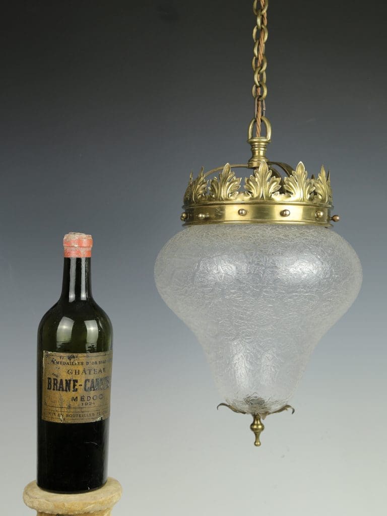 Antique Crown Pendant Light with Cracked Glass Teardrop Globe (Stamped)
