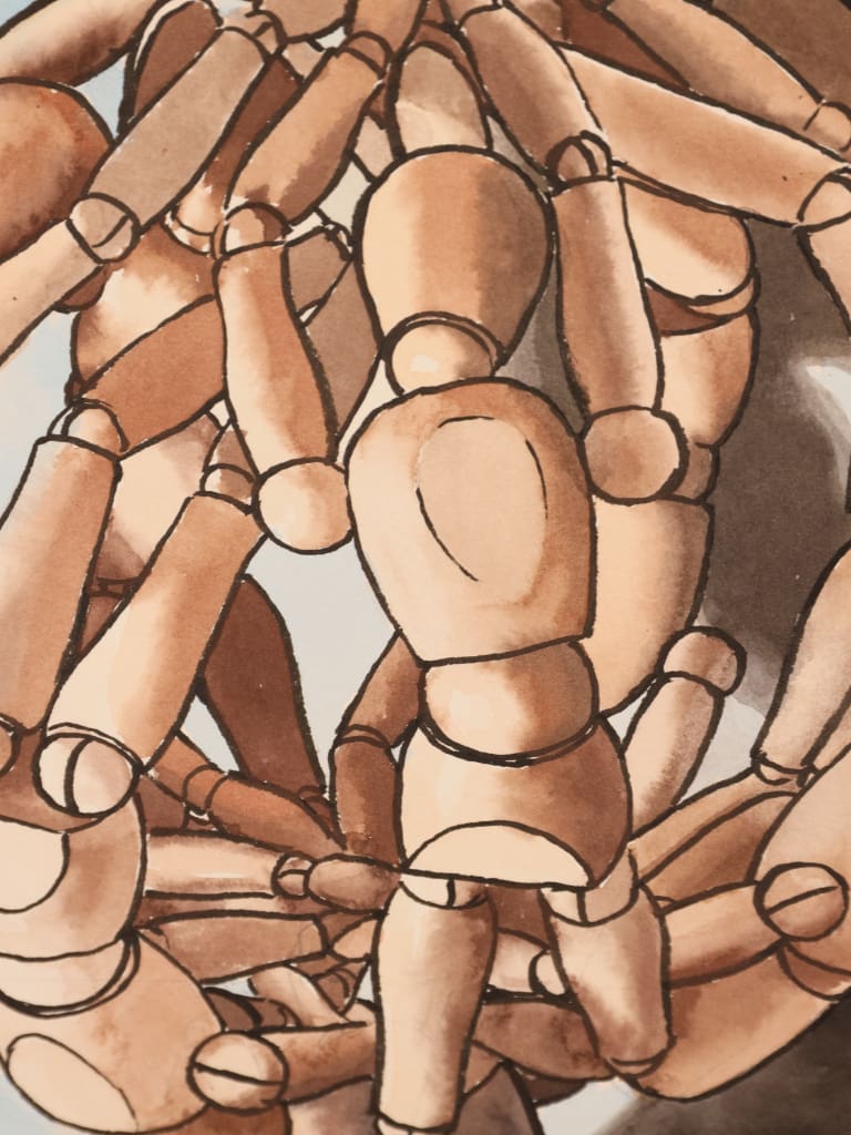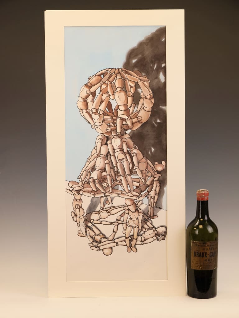 The painting depicts a rhythmic arrangement of articulated mannequins, figures that Carruthers famously referred to as his "anonymous surrogates." The ink work is incredibly precise, detailing the mechanical joints and wooden grains of the figures, giving them a physical "presence" that belies their inanimate nature. These figures are set against a luminous, ethereal background of blue and grey washes, suggesting they are suspended in a subterranean or dreamlike theatre. The mastery of the media is evident in how the watercolour creates a sense of infinite space, while the sharp ink lines anchor the figures in a rigid, structural reality.