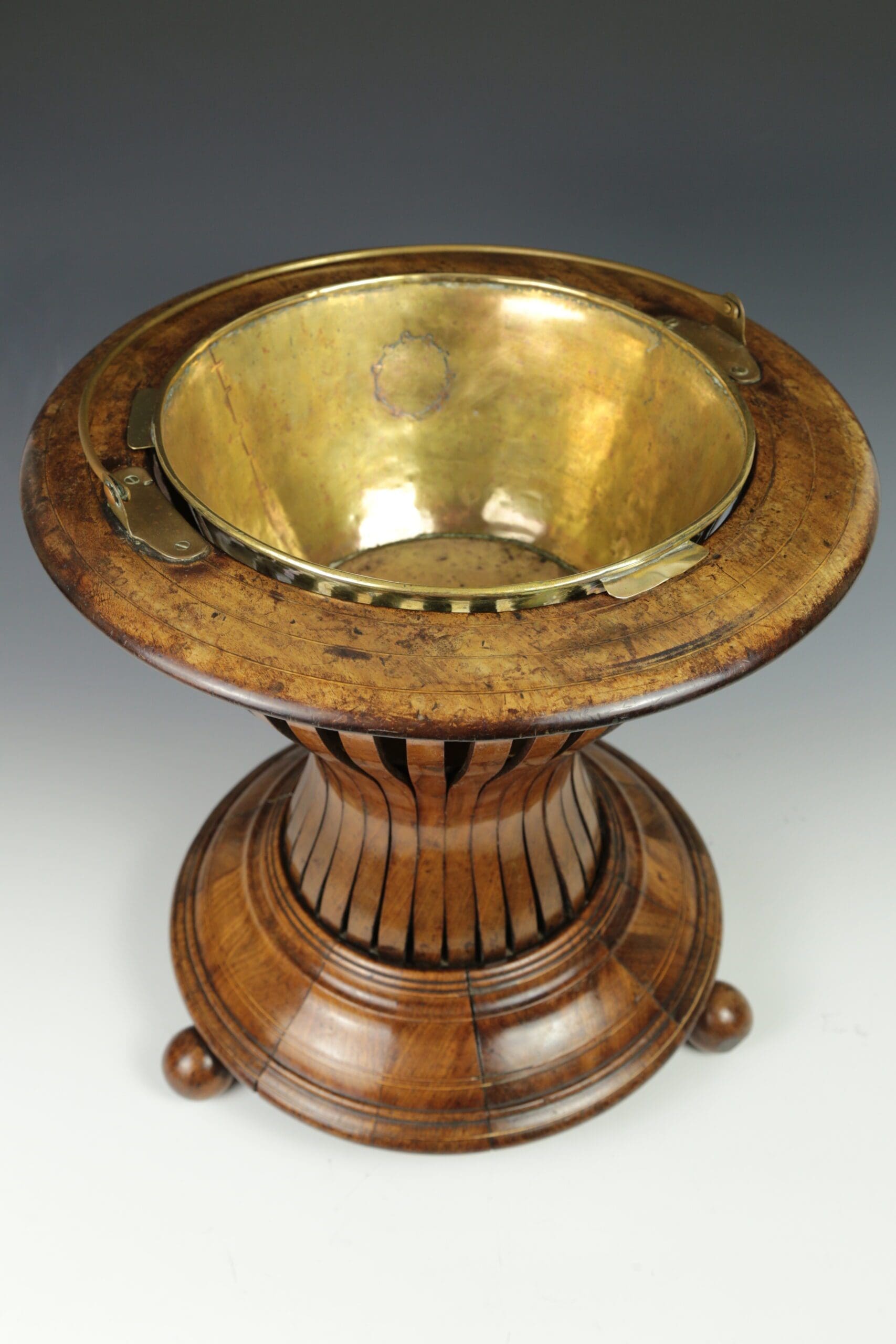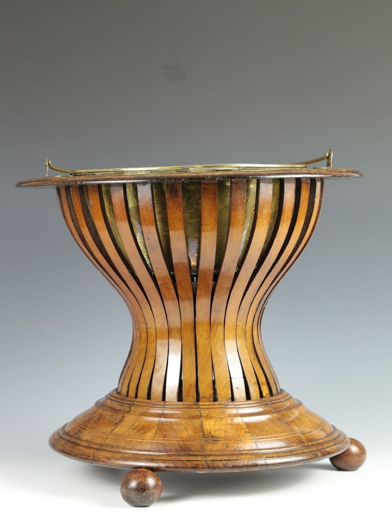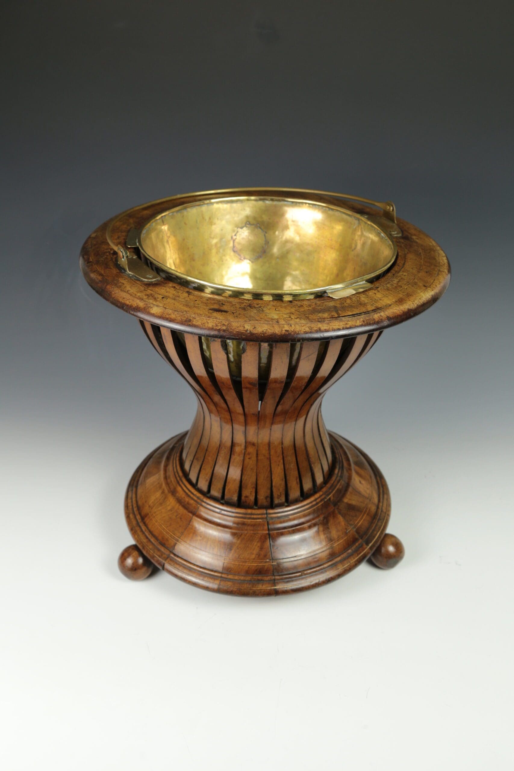Originally used to keep a teapot warm by the fireside, this Dutch walnut jardinière features elegant slatted sides and a shaped circular base with boxwood stringing, standing gracefully on three ball feet. It retains its original brass liner and carrying handle, showcasing timeless craftsmanship.