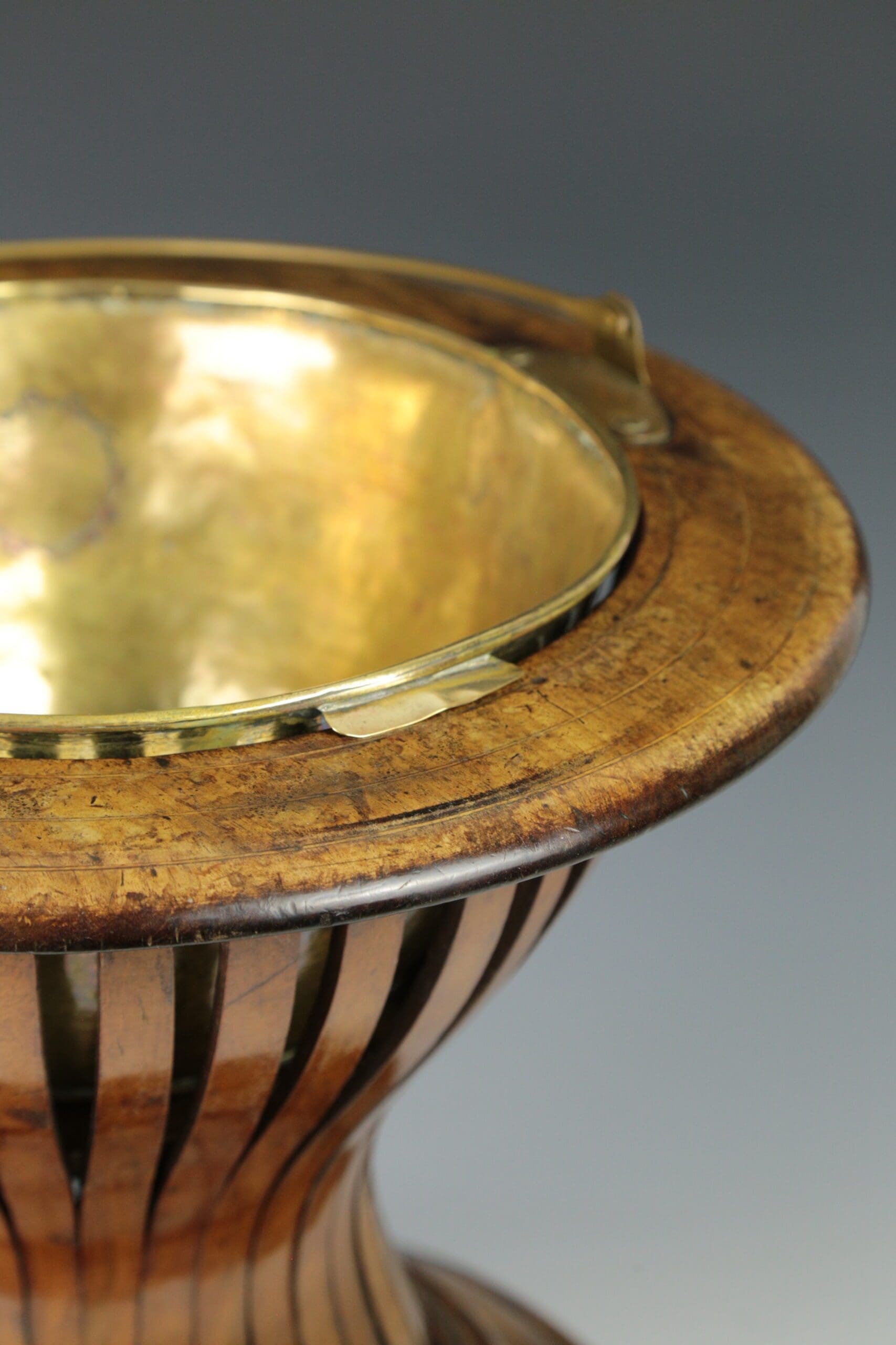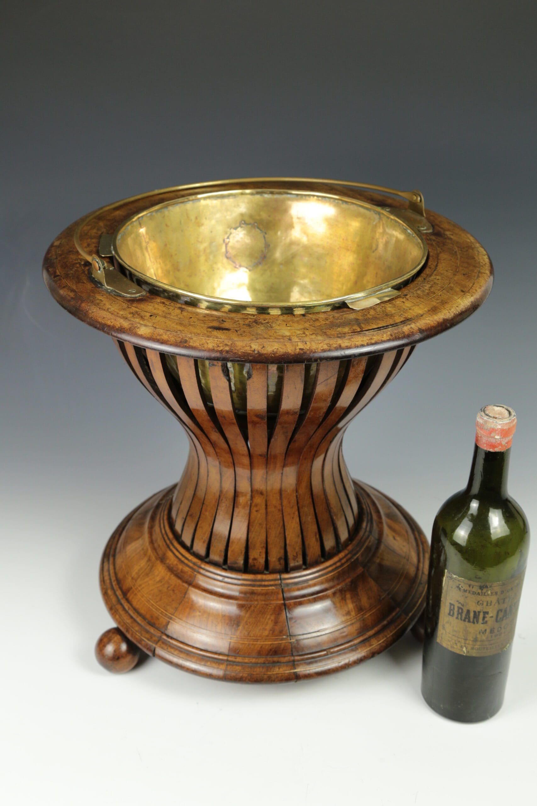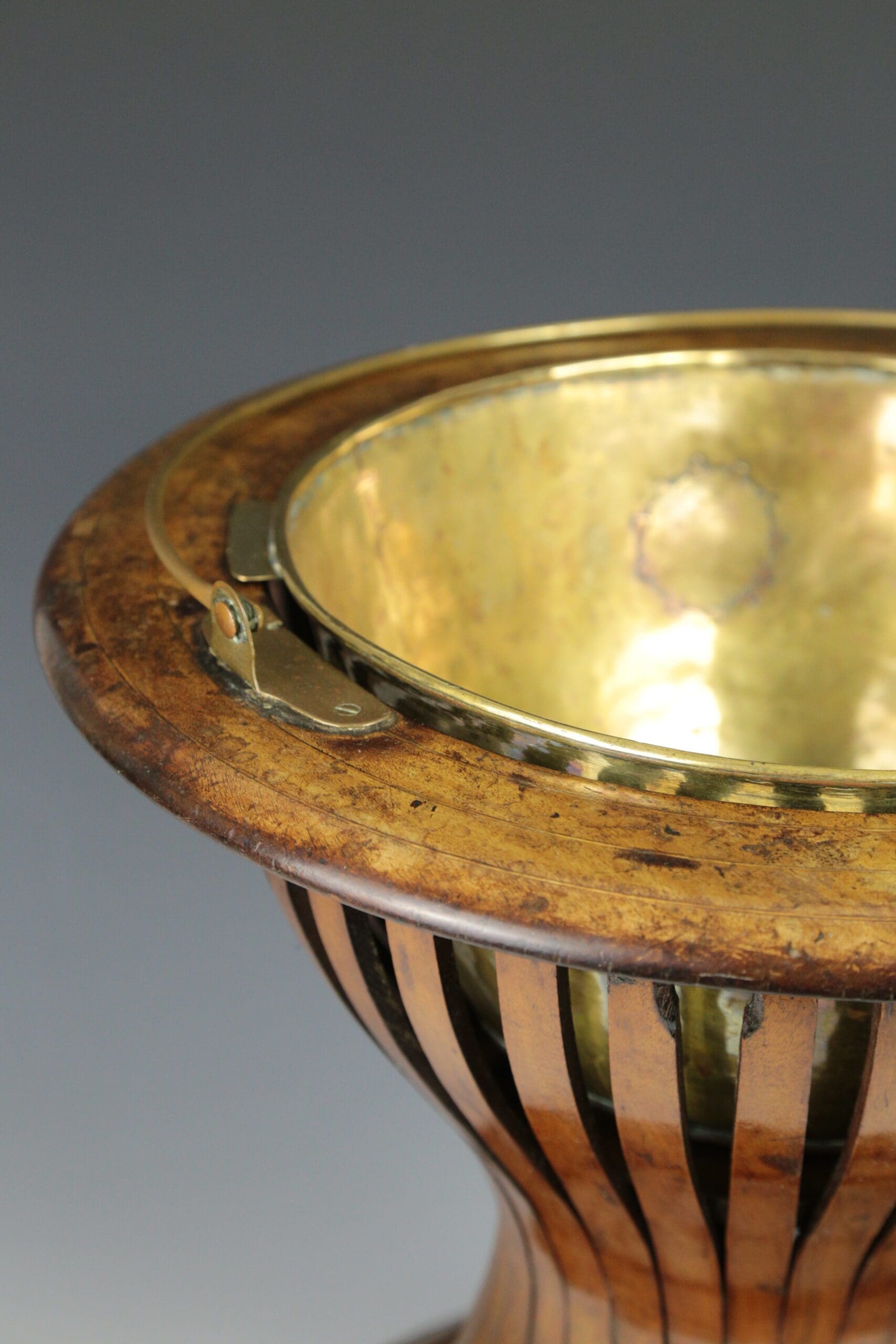 Originally used to keep a teapot warm by the fireside, this Dutch walnut jardinière features elegant slatted sides and a shaped circular base with boxwood stringing, standing gracefully on three ball feet. It retains its original brass liner and carrying handle, showcasing timeless craftsmanship.