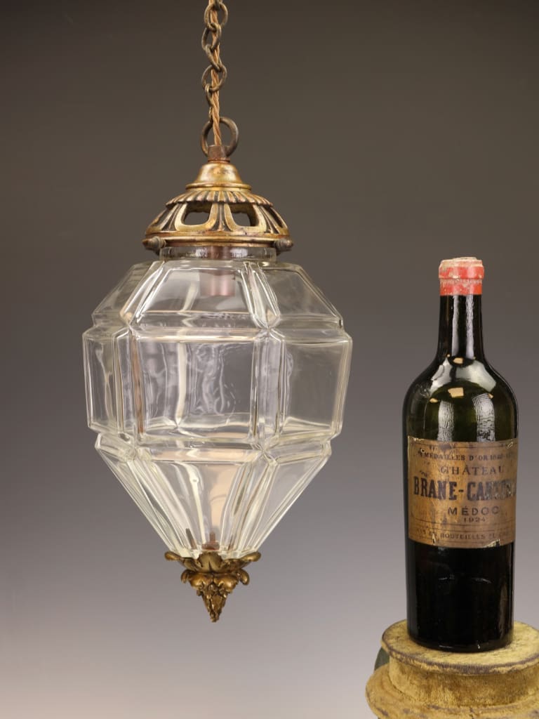 A finely made early 20th century faceted glass hall lantern, of particularly elegant geometric form, complete with its original cast brass mounts and suspension chain. This beautifully proportioned lantern demonstrates the refined taste of the Edwardian and early interwar period, where classical restraint evolved into subtly modern forms.