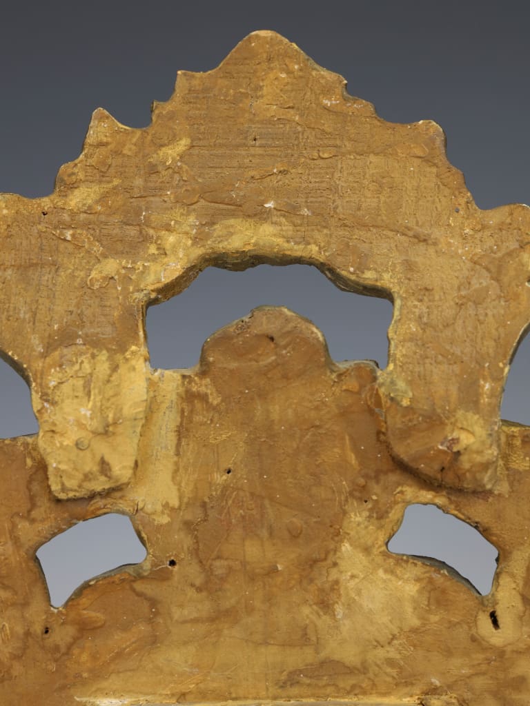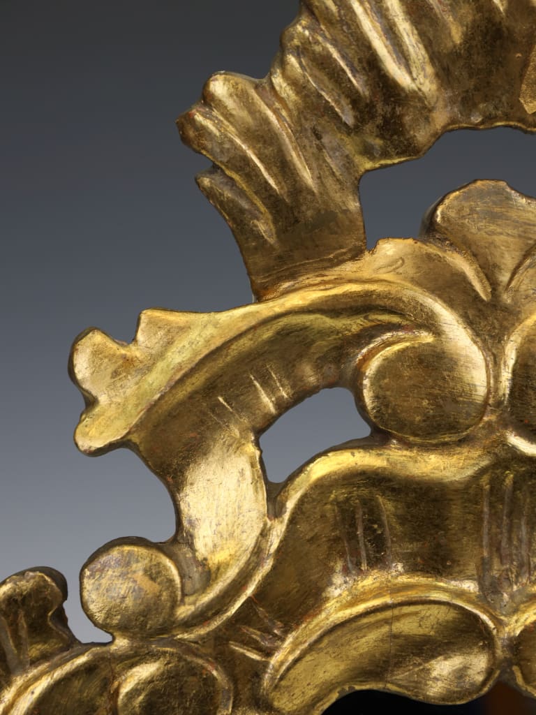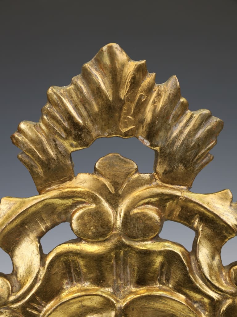 The original gilding exhibits a lovely, aged character with minor, stable cracking to the composition at the delicate extremities, consistent with age. There is visible rubbing to the gilt, revealing the warm underlying tones.