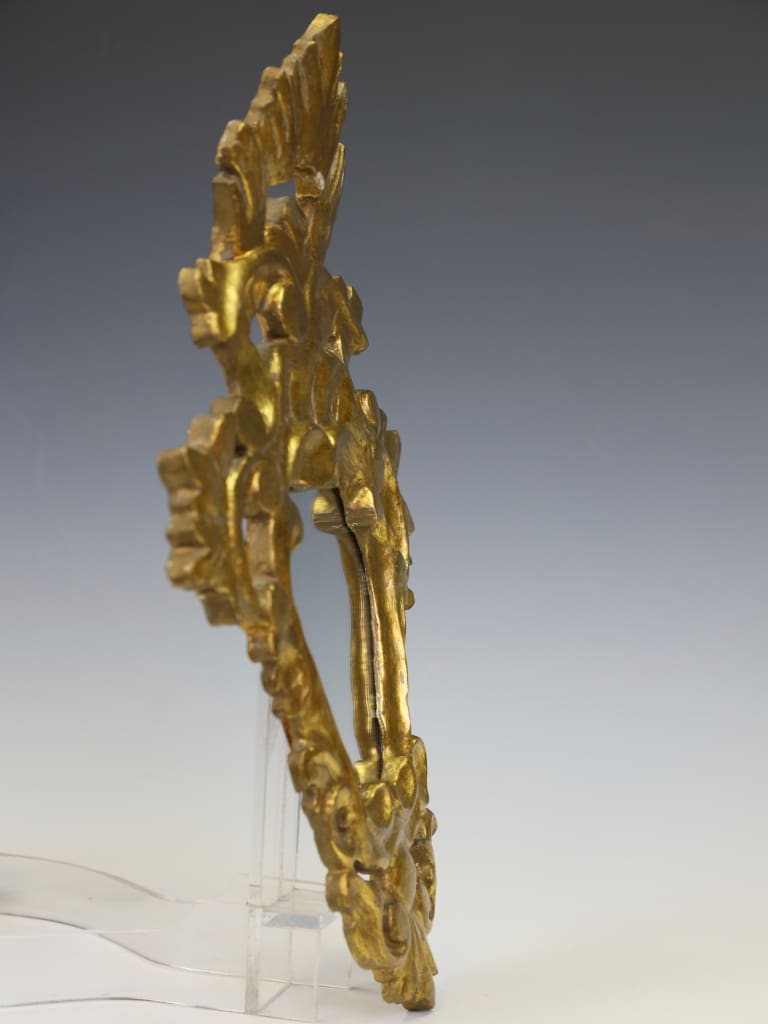 "In the world of French decorative arts, scale is everything. This mirror manages to pack the theatricality of a palace ballroom into a mere 41 centimeters. It is the perfect 'jewel' for a small gallery wall or an intimate powder room. What I find most appealing is the authentic wear to the gilding—you can see the red bole and the timber peeking through the high points, which provides that unmistakable 'shabby-chic' veracity that simply cannot be manufactured."