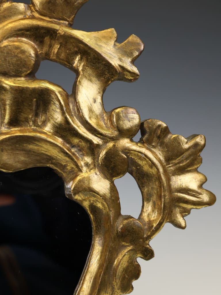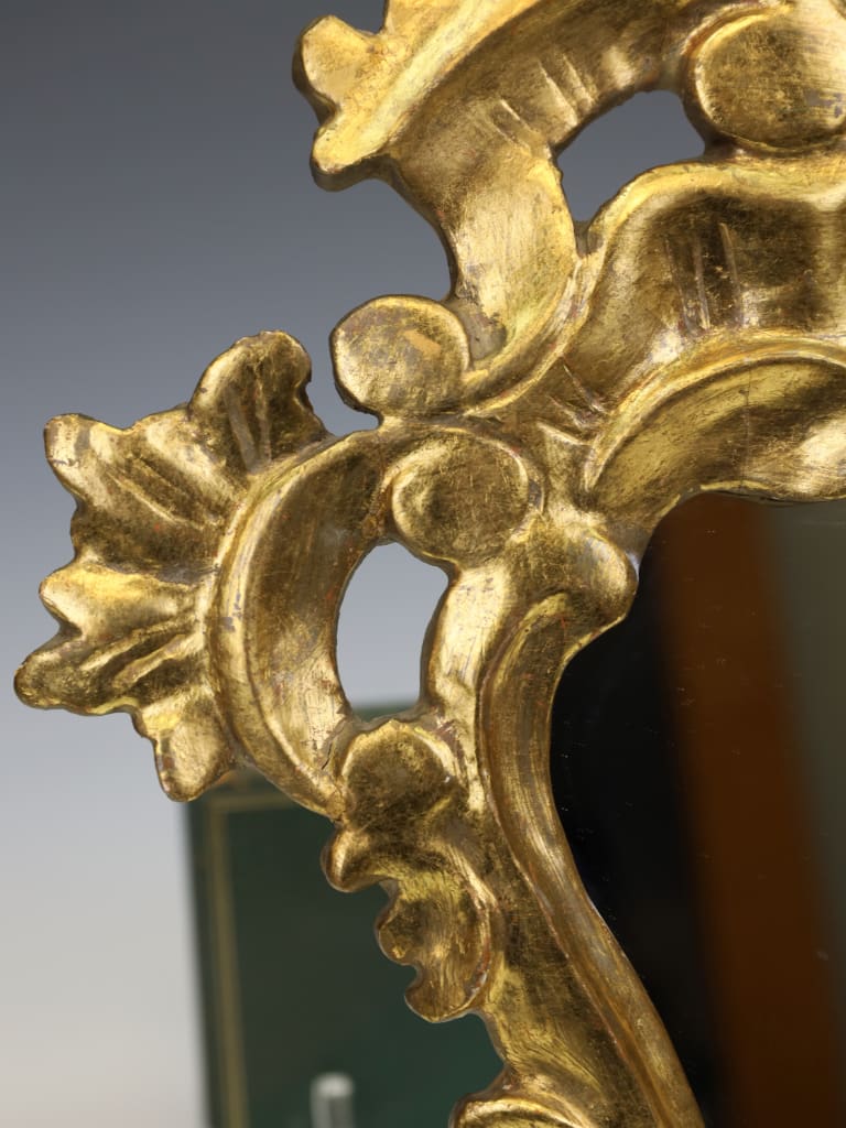 This charming mirror is an exercise in sculptural fluidity, featuring a highly animated frame composed of sweeping C-scrolls, stylised acanthus foliage, and a prominent pierced cresting. The frame’s silhouette is distinctly irregular, a hallmark of the Rococo style, designed to break the rigid lines of traditional interior architecture.