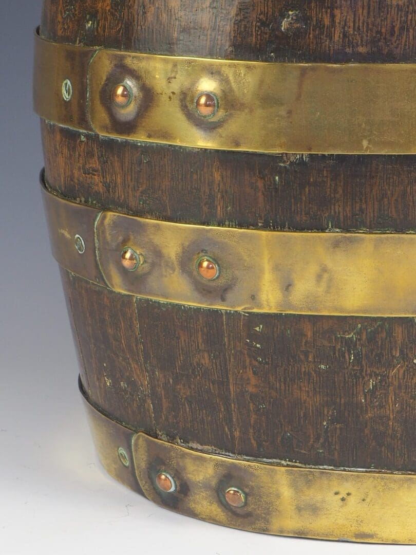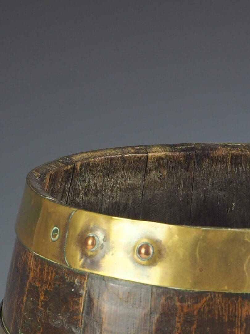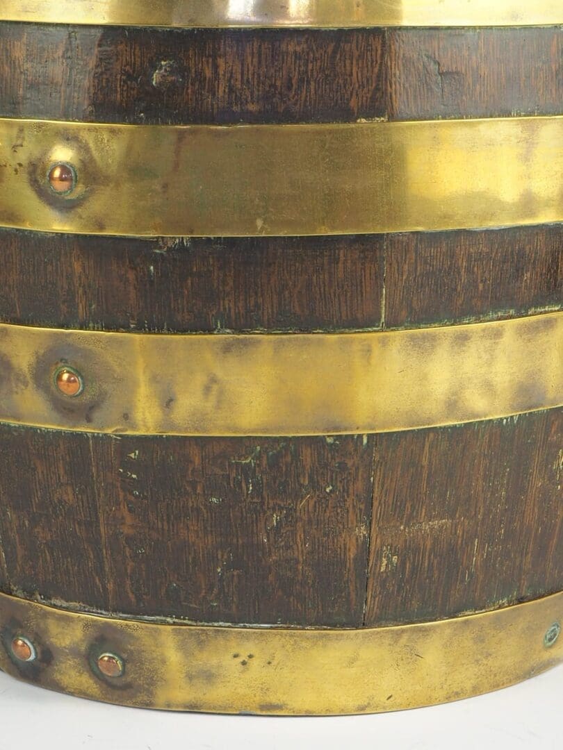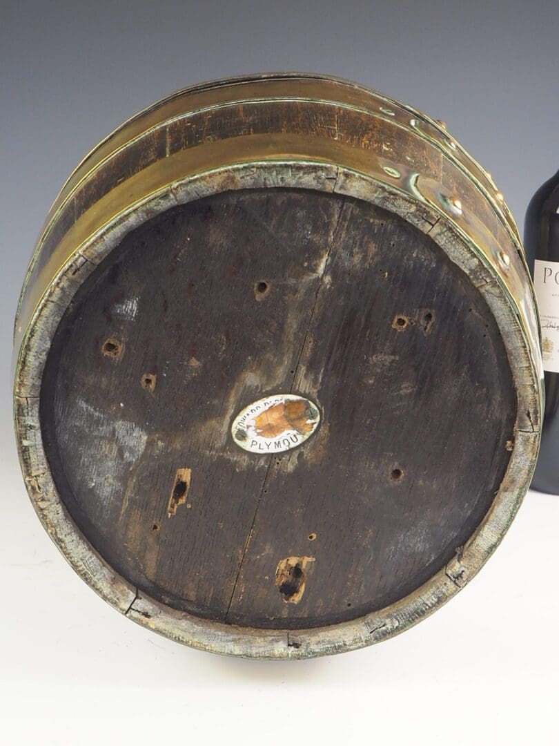 Small, round shaped oak barrel with five polished brass bands. Found in England, Plymouth.