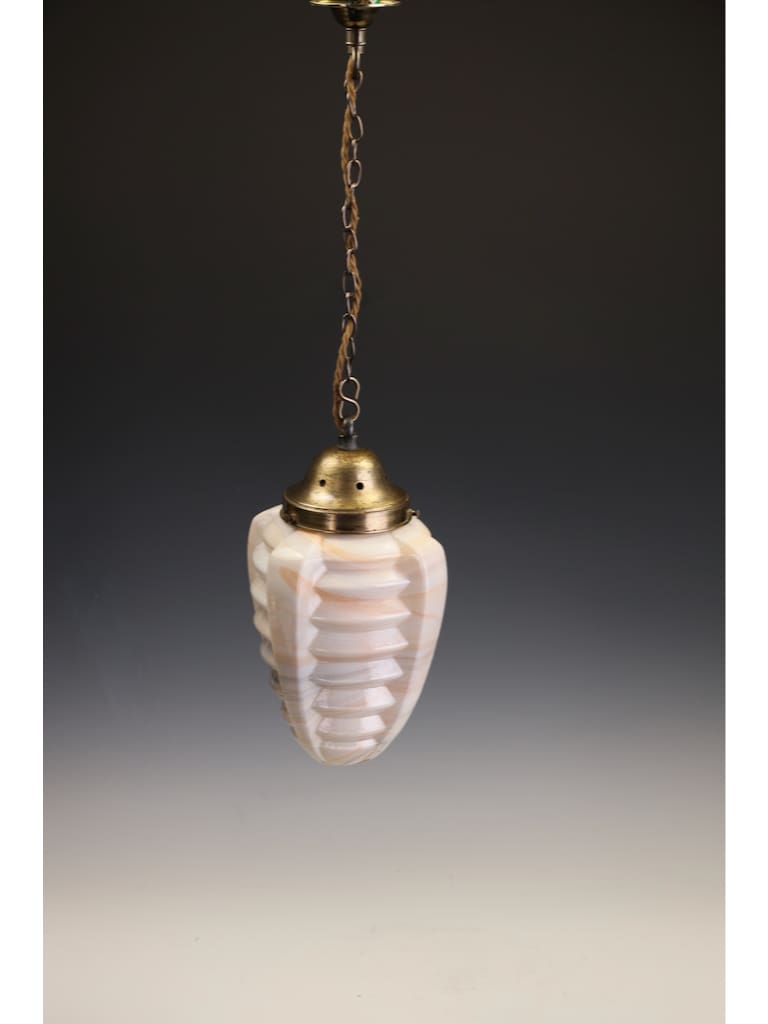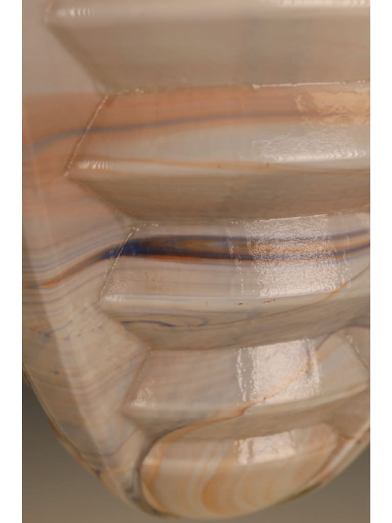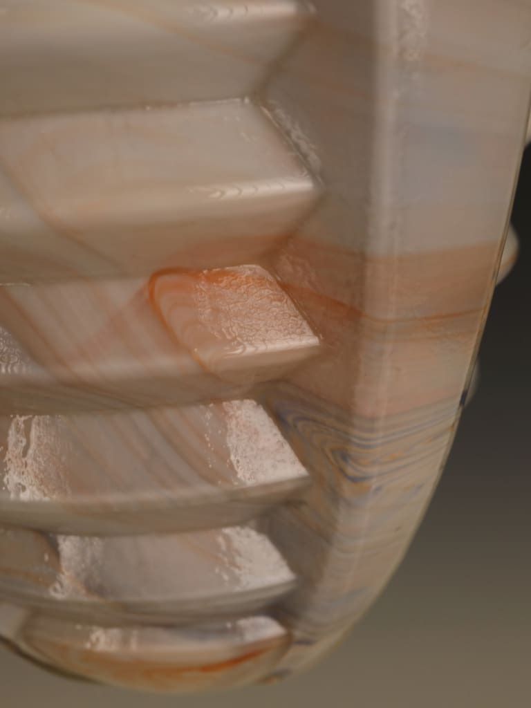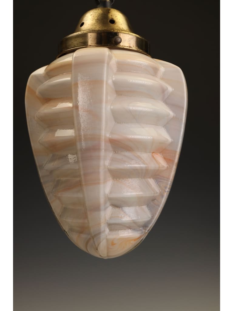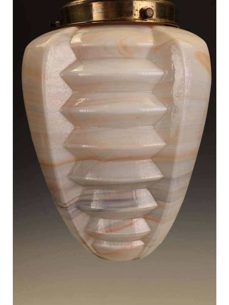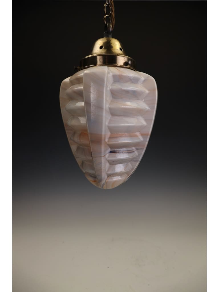 The pendant is beautifully formed, its bold geometric body worked with pronounced ribbed facets that capture and reflect the light, enhancing the natural swirling patterns within the glass. The glass itself displays the characteristic warm tones and subtle translucence for which high-quality slag glass is so admired, producing a soft yet atmospheric glow when lit.