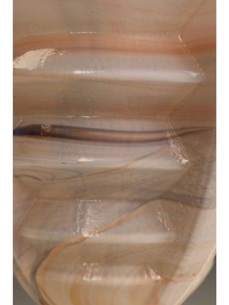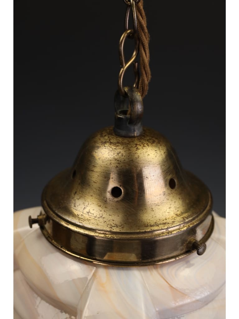 A striking and rare example of early 20th century lighting, this large ceiling pendant is crafted from exquisite slag glass, composed of three distinct layers – a lustrous opaline, richly veined slag marble glass, and a clear glass outer surface which lends depth and vibrancy when illuminated.