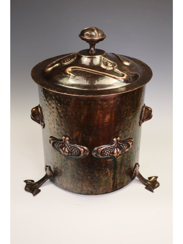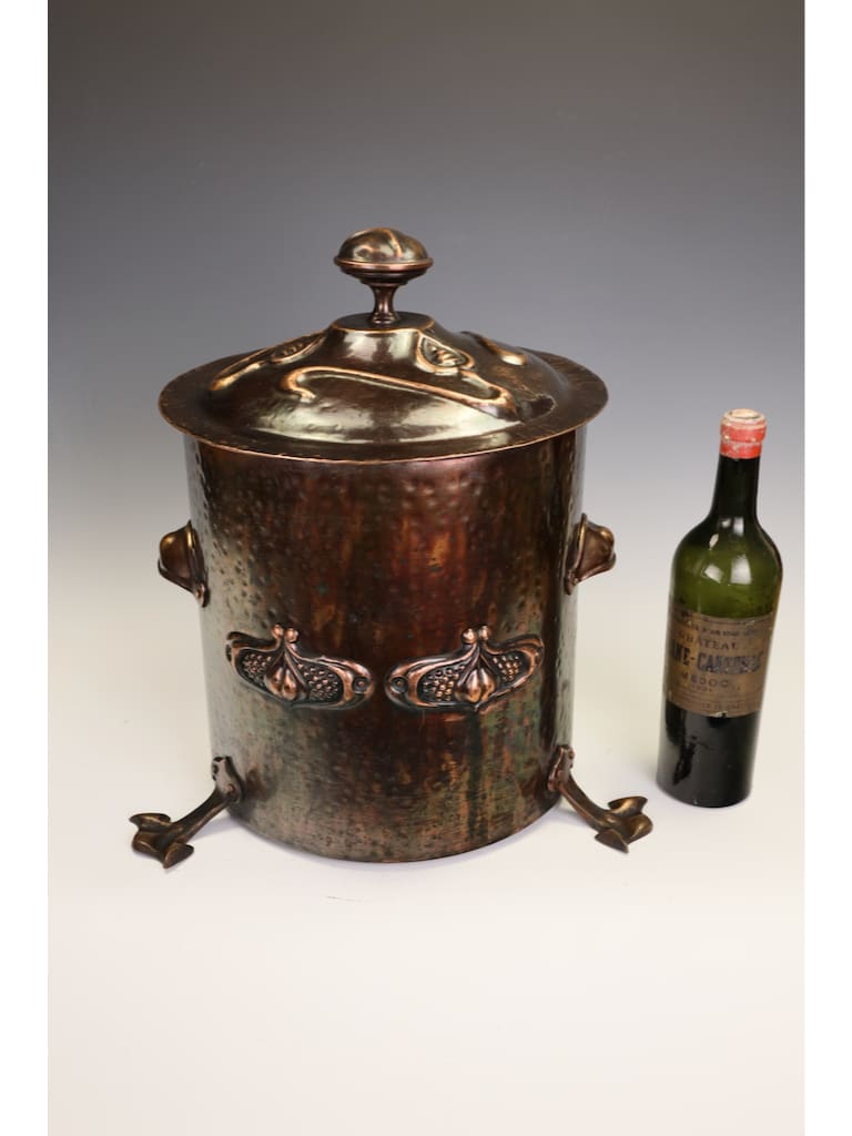 The piece is highly decorative. It stands on three distinctive, splayed, scroll-foot or paw-style feet, which elevate the bucket from the hearth. The front is adorned with two symmetrical, applied bronze or darker copper plaques, featuring stylised organic motifs (resembling winged insects or stylised seed pods), riveted to the body in a typically Arts & Crafts manner.