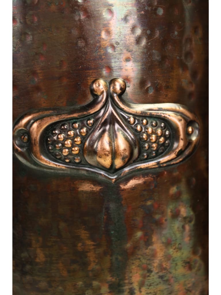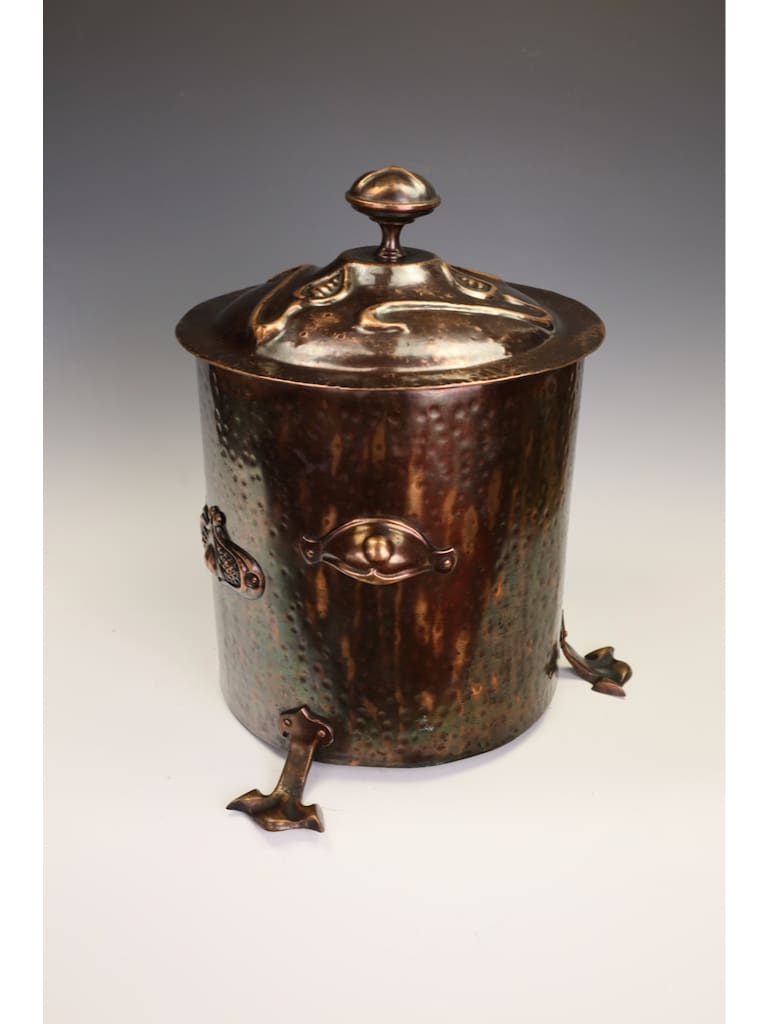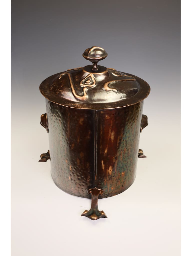 The copper body is visibly hand-hammered (planished), showcasing the work of the craftsman. The decorative elements—such as stylised floral or insect motifs—and the functional tripod feet are applied, demonstrating an integrated design that serves both form and function. It aligns with the work of noted workshops such as the Newlyn School or pieces produced by manufacturers embracing the style, like W.A.S Benson or The Birmingham Guild of Handicraft.