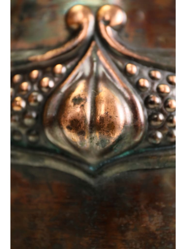 This piece is an outstanding example of the Arts & Crafts commitment to honest, handcrafted materials and naturalistic decoration, designed to elevate functional domestic objects into works of art. Its robust form and rich, deep patina make it a distinguished addition to any period fireplace setting.