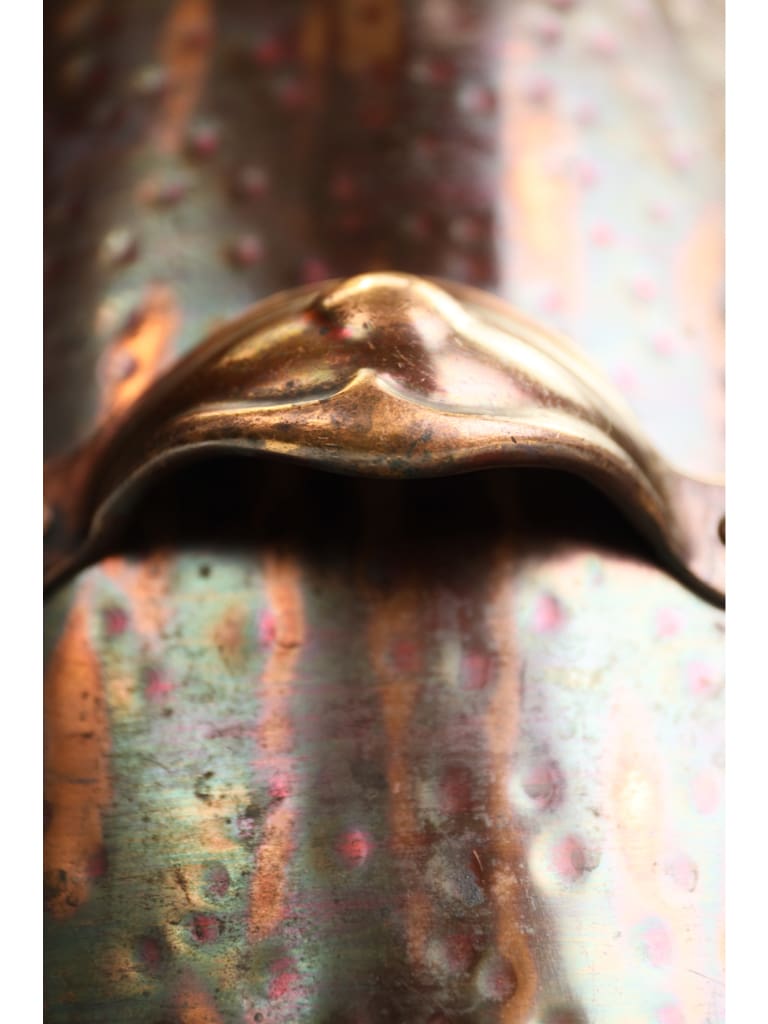 A superb antique fireside coal bucket (or purdonium), crafted from heavily hammered copper with bronze detailing, typical of the British Arts & Crafts movement, circa 1890–1910.