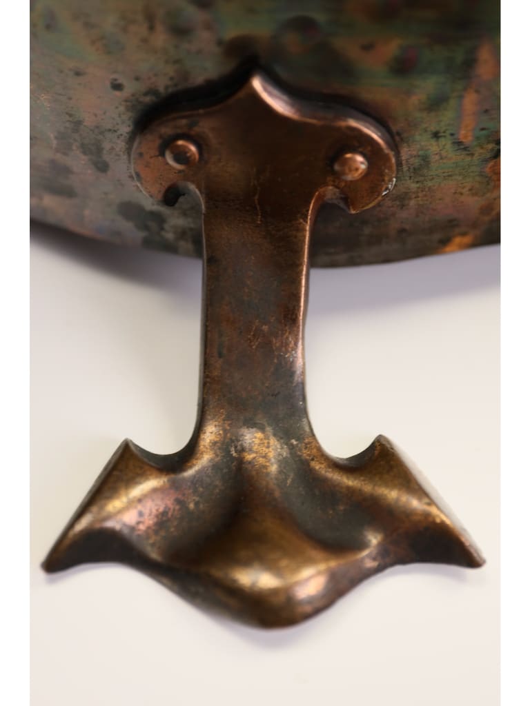 The sides are fitted with two solid, cast handles (likely bronze or darkened copper) for ease of lifting.