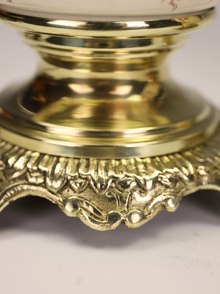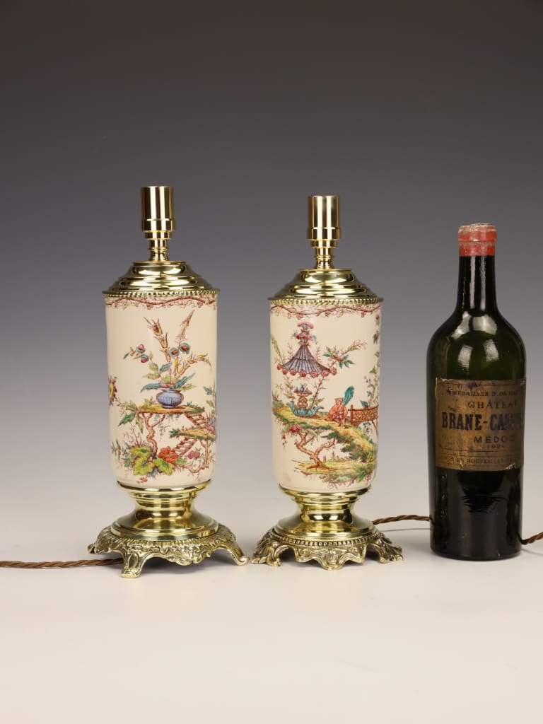 Both lamps are in excellent condition, showing only minimal signs of age and use. The ceramic bodies are free from cracks, chips or restoration, and the hand-painted decoration remains vibrant and well-defined throughout. The gilt metal bases and fittings are sound, with light surface wear and gentle rubbing to the gilding, consistent with age. The bases are sligtly different which gives them a minimal difference in height.