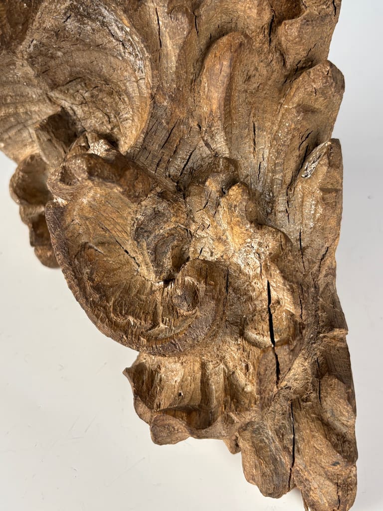 The shelf is executed in limewood, a medium highly prized for its exceptionally fine grain, which allows for the creation of intricate, deeply undercut details. The carving flows from the right-angled corner with a cascade of scrolling foliate motifs. The deeply carved leaves and volutes curl and unfurl with a fluid, almost restless energy that is the hallmark of the Rococo. The masterful carving creates a powerful sense of three-dimensional movement, with light and shadow playing across the surface, turning a functional object into a piece of pure sculpture.