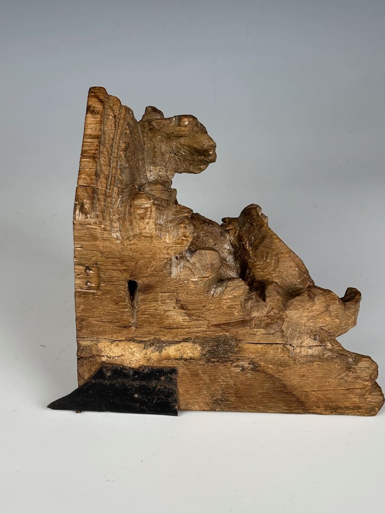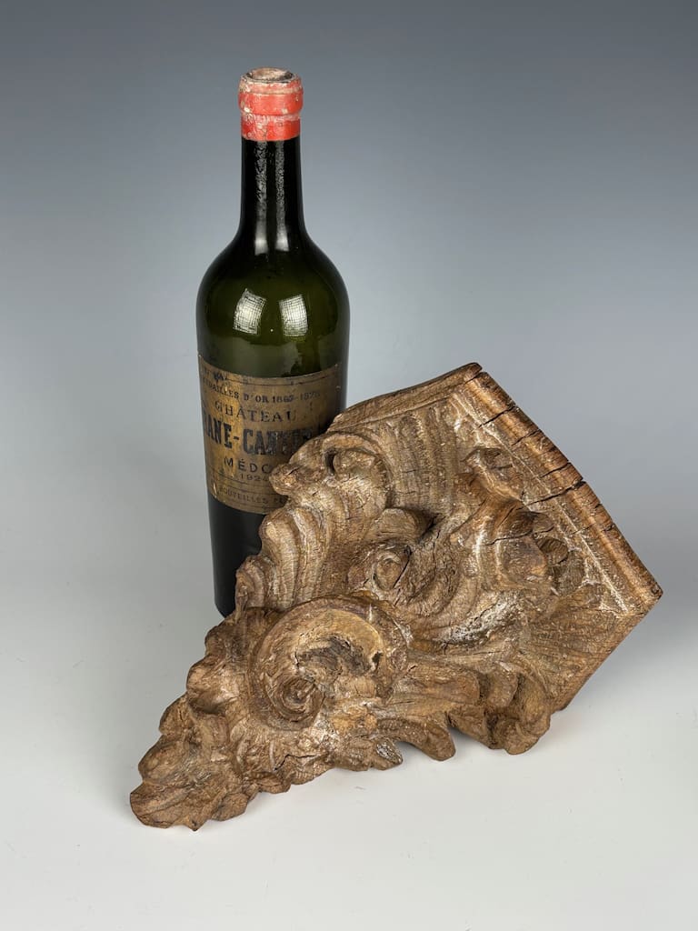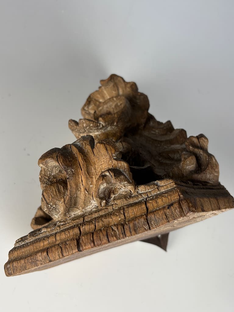 This shelf is in good antique condition for a piece of its type and age. Its salvaged state does not diminish its artistic or historical value, but rather enhances its unique appeal as a genuine artifact of 18th-century craftsmanship. It is stable and ready to be wall-mounted and admired.