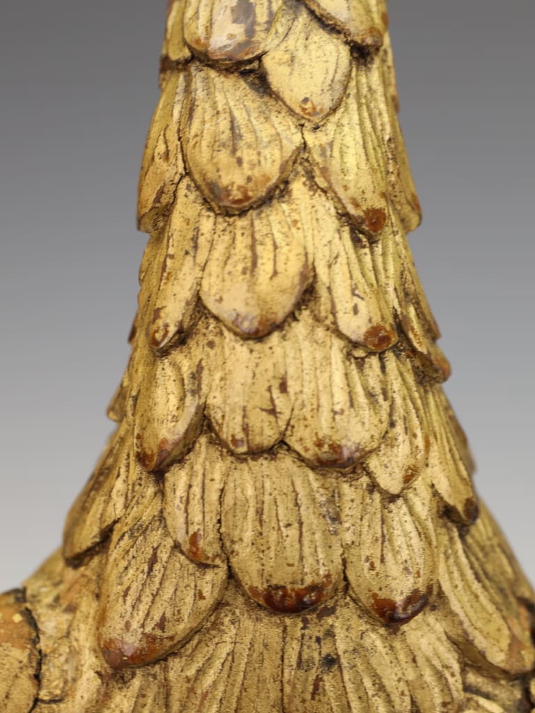 The carving remains structurally sound and retains its original gilded surface with an attractive aged patina. Both wings, however, show historical damage: one wingtip is lacking, and the opposing wing has an old break which has been rejoined. The repair is visible, though stable. Minor rubbing and age-related wear to the gilding throughout, consistent with its period and use. No evidence of modern overpainting. The piece is well-presented on its later stand and remains an impressive and well-preserved example despite the noted losses.
