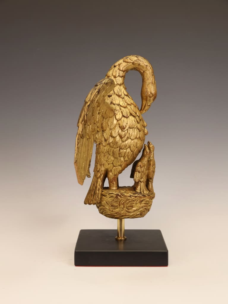 A beautifully carved and richly gilt wooden figure depicting the venerable motif of the Pelican in Her Piety, mounted on a later museum-style stand. This exceptional piece, most likely late 18th to early 19th century, exemplifies the highly symbolic devotional carvings once found in ecclesiastical interiors across Britain and Continental Europe.