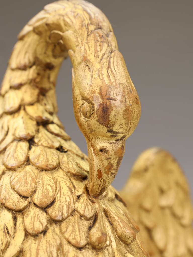 The surface retains its original gilding, now beautifully mellowed with age into a warm, softly burnished patina. Subtle traces of red bole beneath the gilding are visible in places, a hallmark of traditional 18th-century gilding practice. The carving exhibits a confident hand, particularly evident in the layered plumage, which creates a rhythmic, almost architectural pattern across the wings and body.