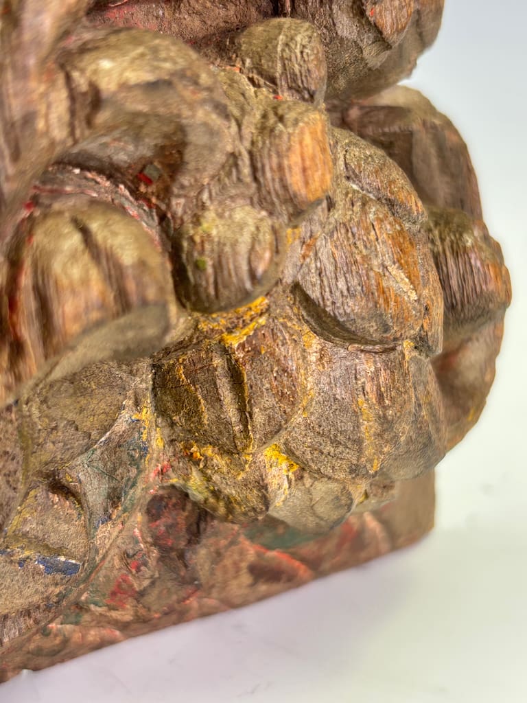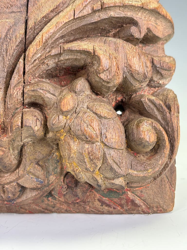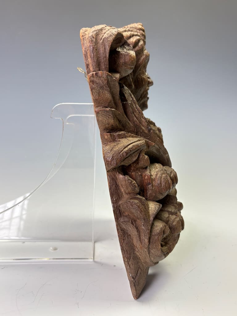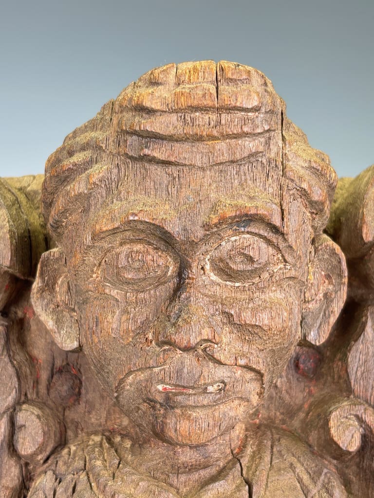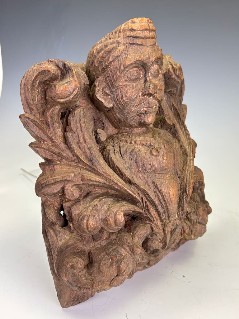 Exquisitely executed in a dense tropical hardwood with a deep, time-softened patina, this remarkable piece features the expressive bust of a noble or guardian figure set amidst voluminous foliate scrolls and stylized acanthus motifs. The carving demonstrates a strong blend of Indo-Islamic influence, with classical Indian iconographic cues subtly integrated into the naturalistic ornamentation. This figure may have once adorned a temple or palace structure, serving either as a bracket, lintel support, or architectural embellishment.