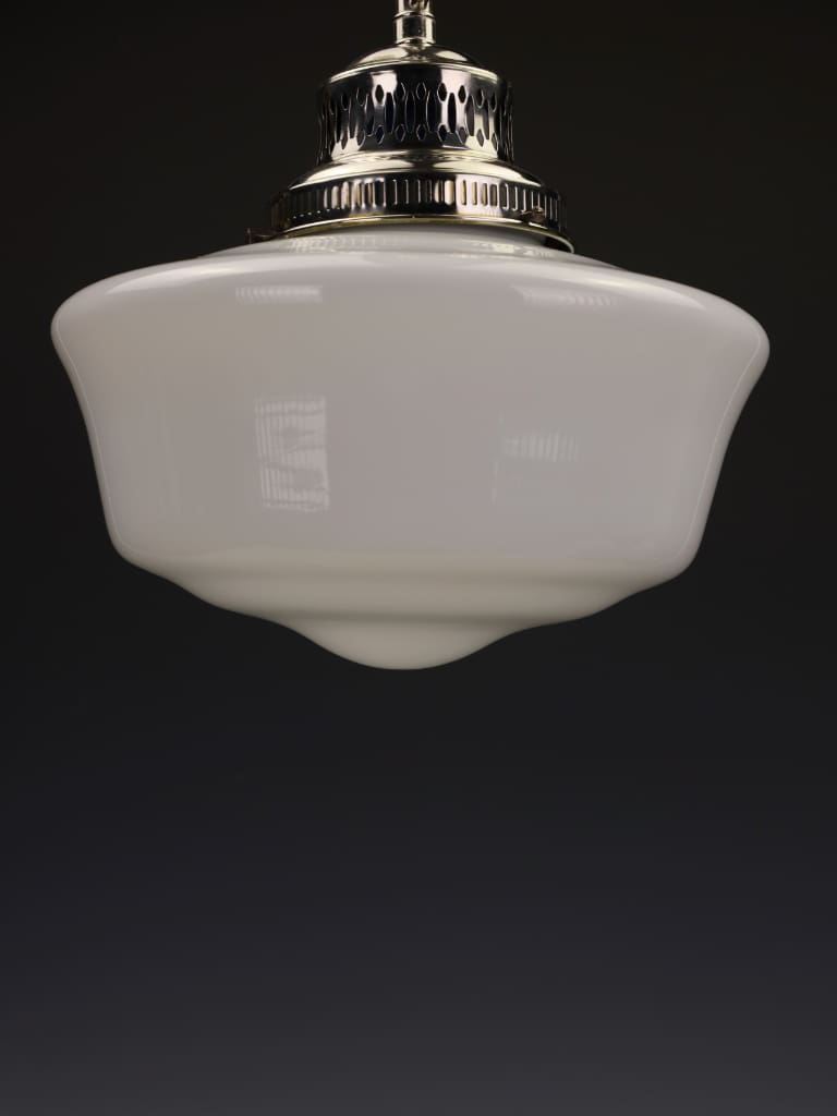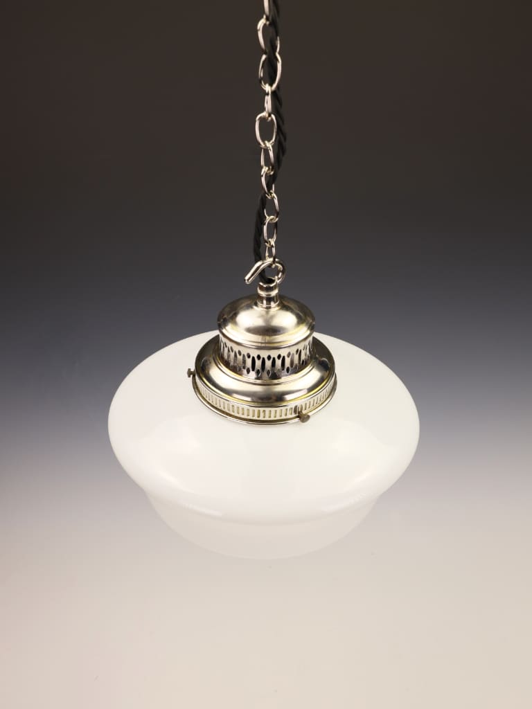 A particularly handsome early 20th-century opaline glass pendant, distinguished by its refined, gently flared shade and original silver-plated gallery. The opaline glass is of excellent quality, offering a beautifully diffused, even light when lit, while its crisp white surface presents with a soft, understated lustre.