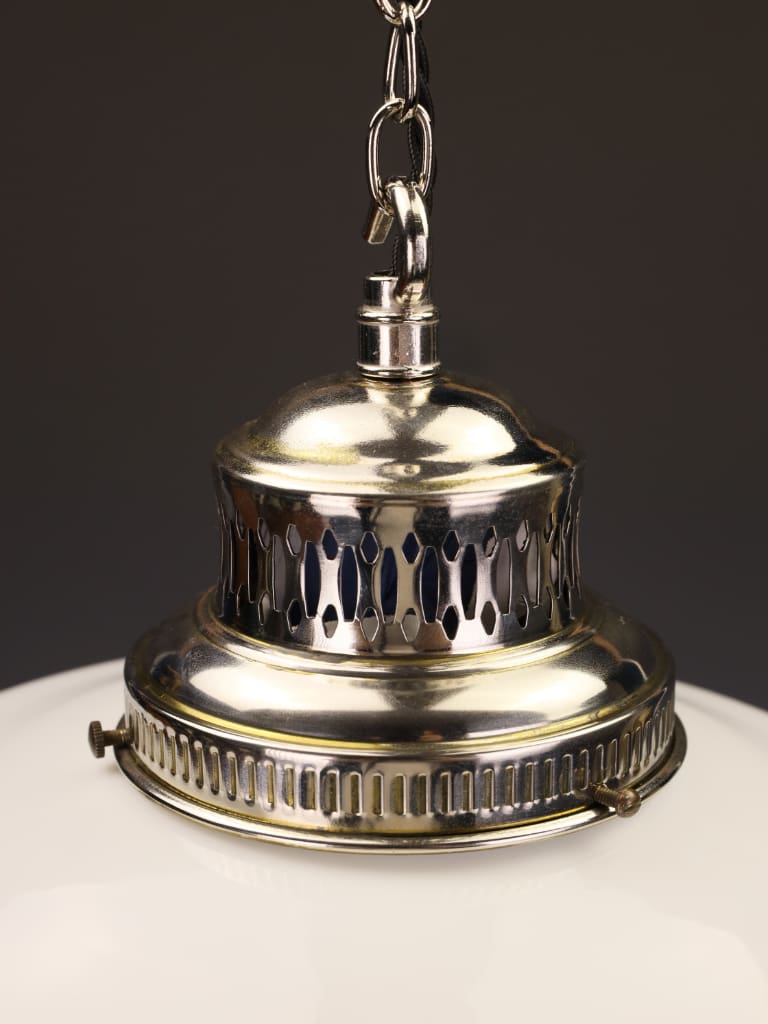 The opaline glass shade presents in excellent antique condition with only minor, age-appropriate surface indications consistent with its period. The silver-plated gallery and chain have been professionally cleaned, preserving the original finish and definition of the pierced detailing.