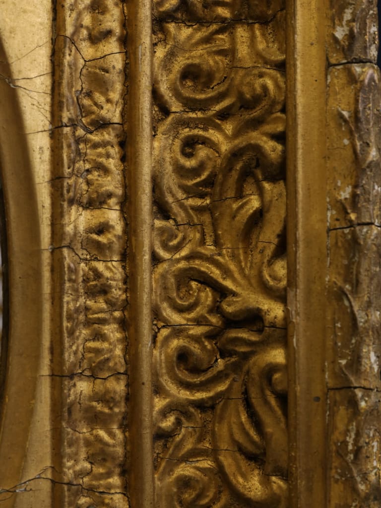 The gilding is original and presents with a lovely 'shabby-chic' grandeur. There are minor losses to the gilding and composition at the extreme edges and corners, revealing the historical gesso beneath, which adds to its antique charm.