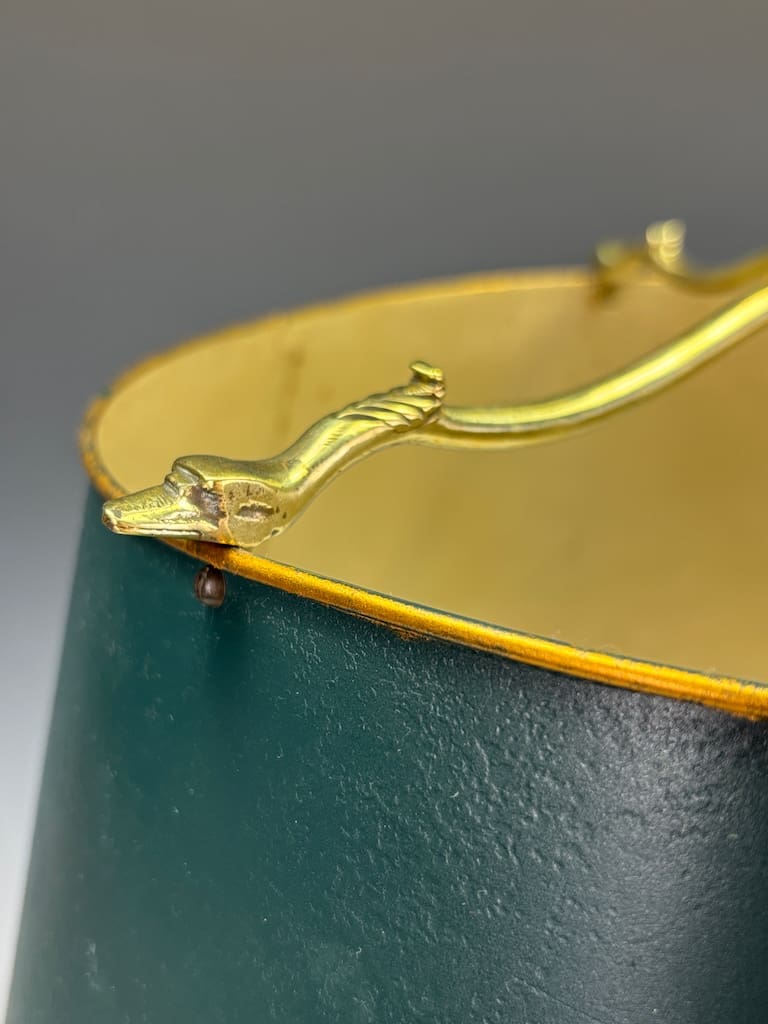 A highly refined French bouillotte-style table lamp, dating to circa 1900, cast in gilt brass with elegant neoclassical detail. This exceptional piece features three finely modelled swan-form arms, each supporting faux candle sockets in the traditional Empire manner. Above rests the original green-painted tole shade, trimmed with a gilt edge, adjustable via the central stem — a hallmark of true bouillotte design.