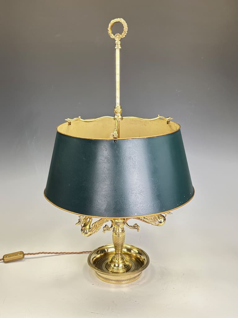 Bouillotte lamps were originally conceived in late 18th-century France to accompany the popular card game bouillotte, and their characteristic adjustable tole shades were designed to control light. This example belongs to the next wave of such pieces, around 1900, when the Empire style saw a refined revival during the Belle Époque — blending classical taste with modern electric functionality.