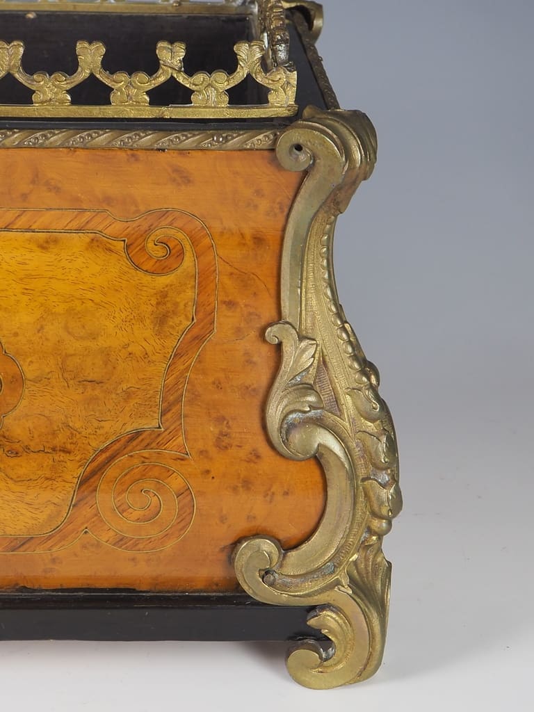 This exquisite jardiniere hails from 19th Century France. It showcases meticulous marquetry inlay, featuring fine metals and lacquer. The piece is adorned with intricate ormolu mounts, adding a touch of elegance.