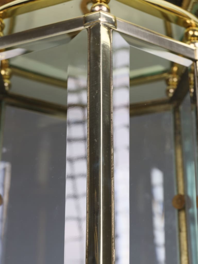 The lantern is of elegant six-sided (hexagonal) form, each side fitted with bevelled glass panels which catch and soften the light. The structure is crafted in gilt brass, retaining a pleasing, mellow patina consistent with age. It is suspended from a matching chain and ceiling rose, giving the piece excellent proportion and balance.