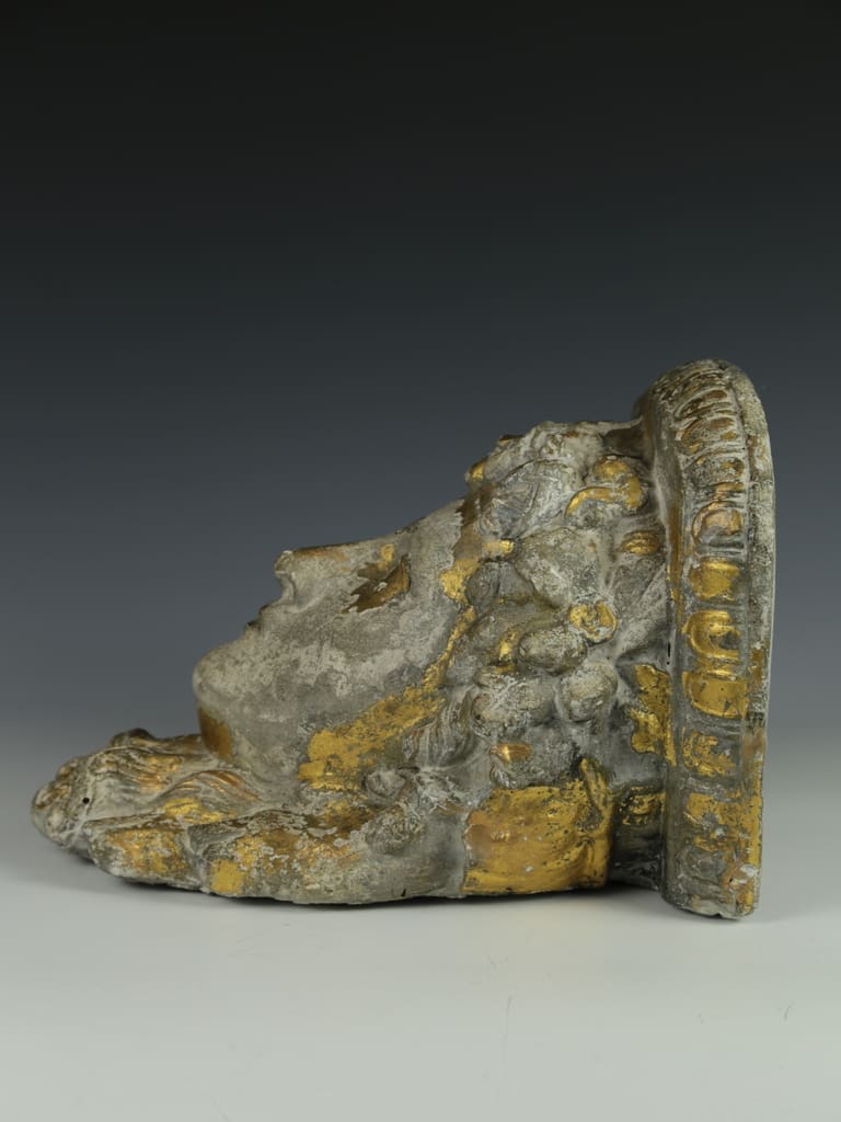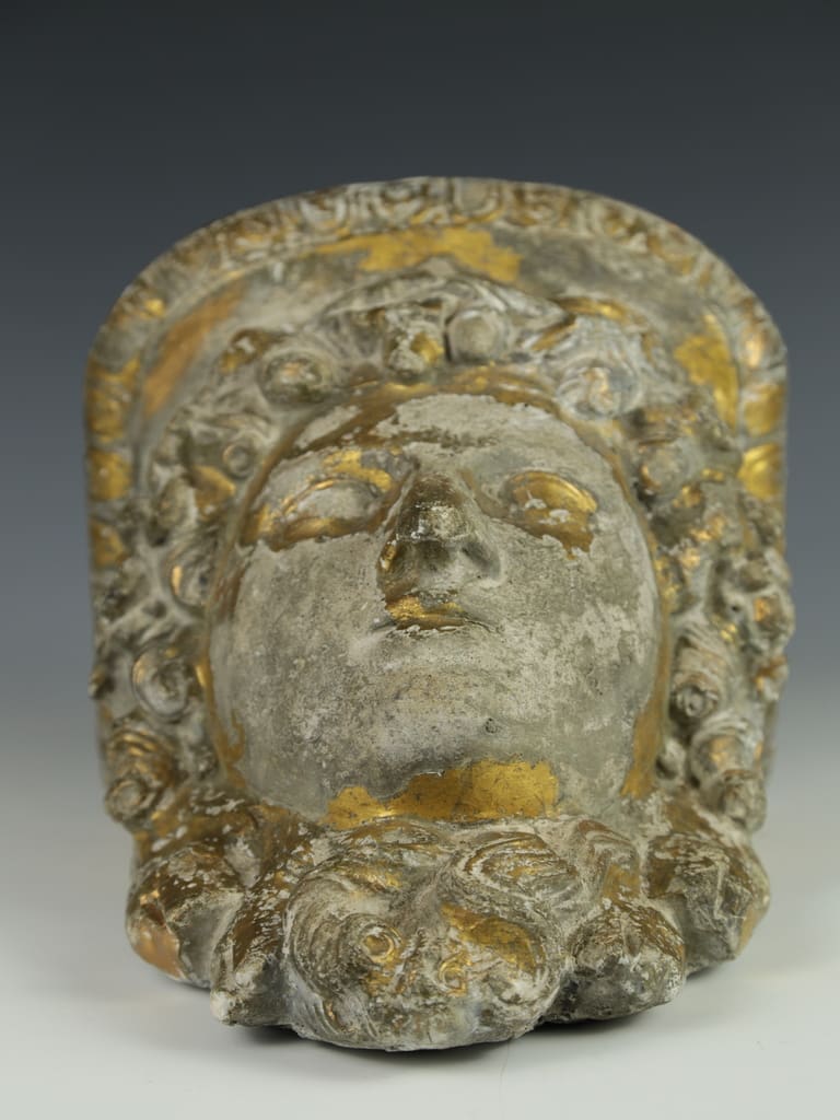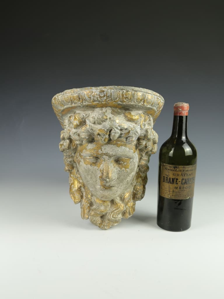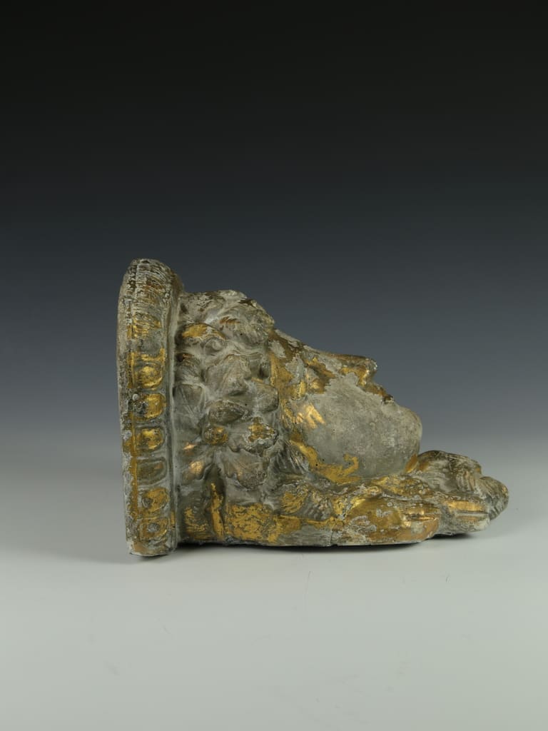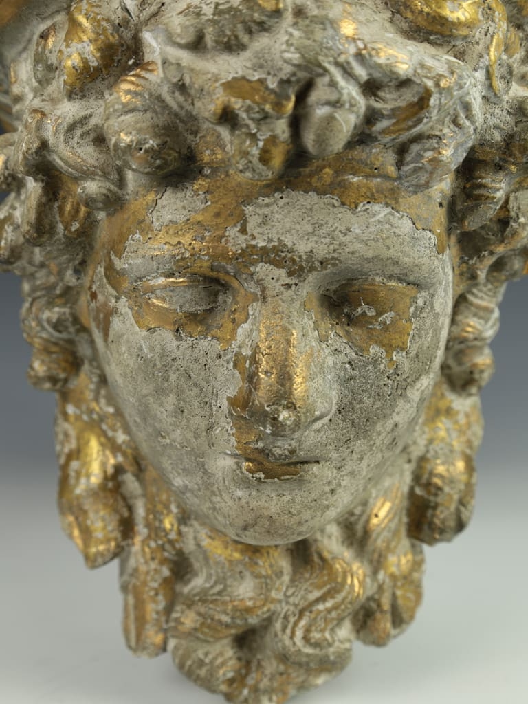 This vintage decorative gilt cast concrete Alexander the Great dispaly shelf is in good condition, displaying a natural aged patina that enhances its classical charm.
