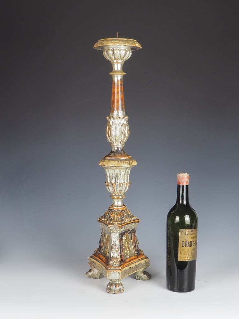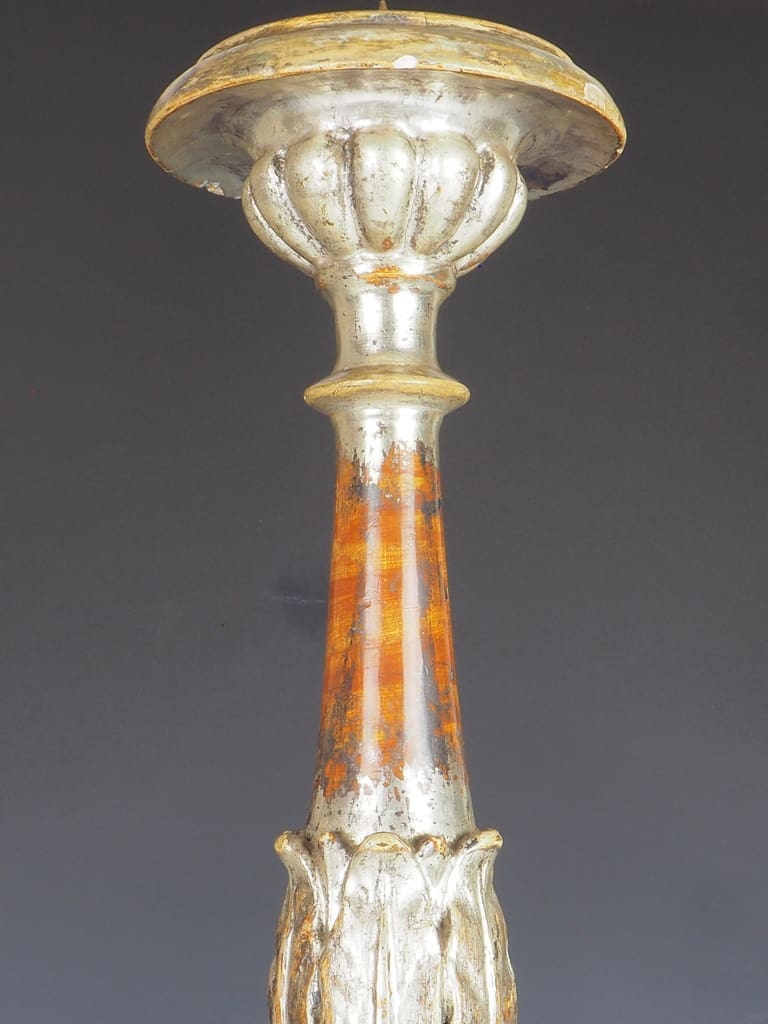 The 18th century was a period of significant artistic and cultural development in Italy. During this time, artisans created intricate and vibrant polychrome works that combined painted and gilded elements to enhance the visual richness of their creations. Candle holders, such as this one, were often used in churches, palaces, and aristocratic homes to provide illumination while also serving as decorative pieces that reflected the wealth and taste of their owners.