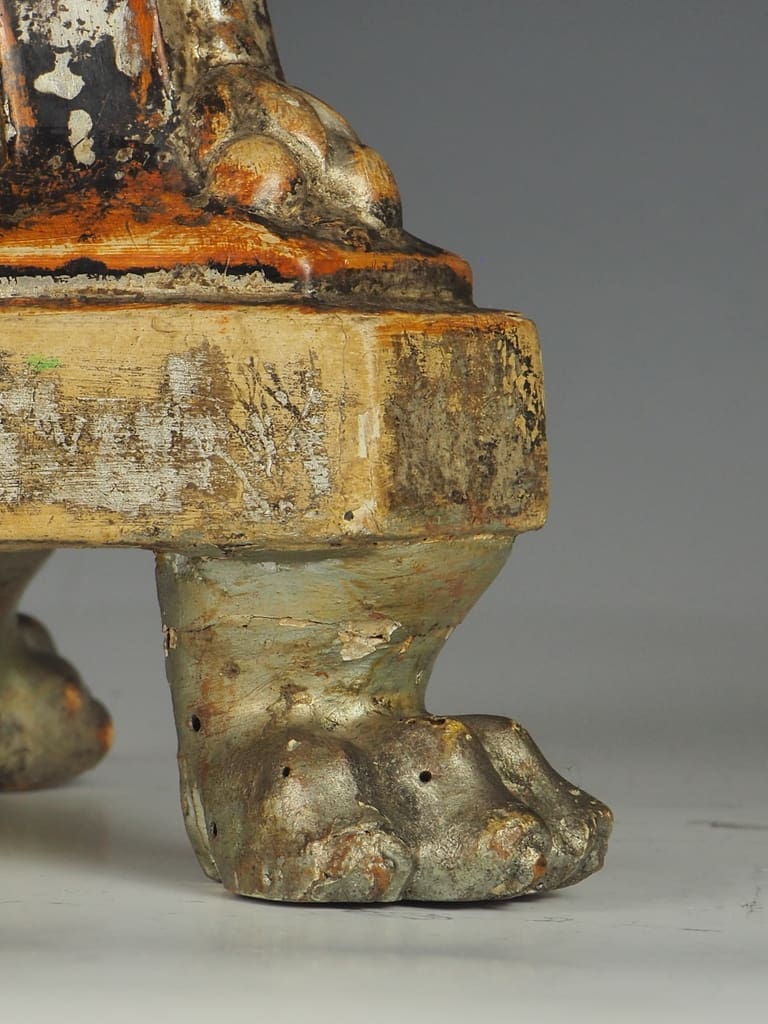 Crafted from carved wood and polychrome, this stunning piece is supported by three elegantly designed claw feet, providing both stability and a touch of grandeur. Each panel of the candle holder features a regal crowned lion, skilfully depicted while holding a dagger, symbolising strength and nobility. The rich polychrome finish enhances the visual appeal, making it a striking focal point in any interior setting.