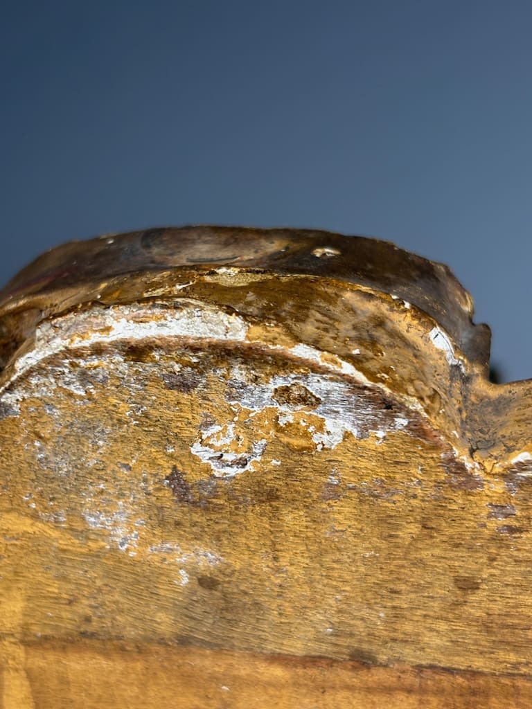 Crafted from solid wood and finished in rich, time-worn gilt, the pediment is adorned with intricate scrollwork and foliate (leaf) carvings in the Baroque style—a hallmark of 18th-century Italian design. Originally part of a grand doorway, mirror, or piece of ecclesiastical furniture, this giltwood pediment is a rare and decorative survivor of a richly ornamented past.