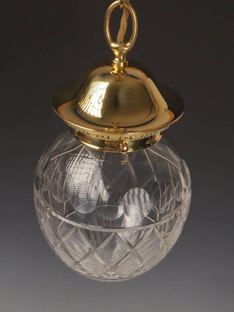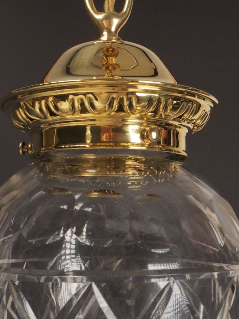 This antique pendant light offers both radiant illumination and a bold decorative statement. Its large, finely cut glass shade captures and refracts light beautifully, casting intricate patterns and soft shadows that enhance the atmosphere of any room.