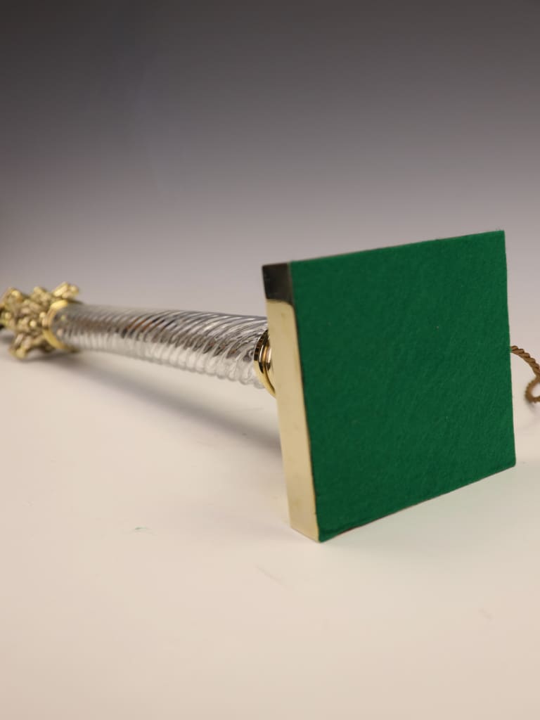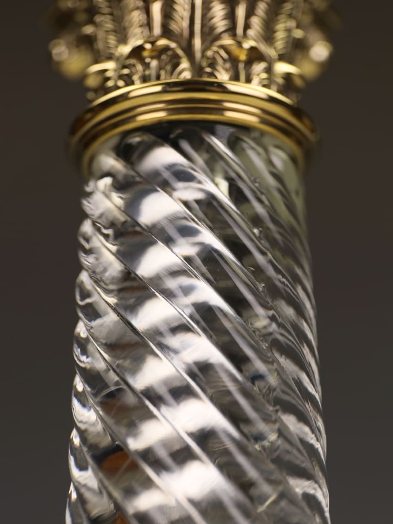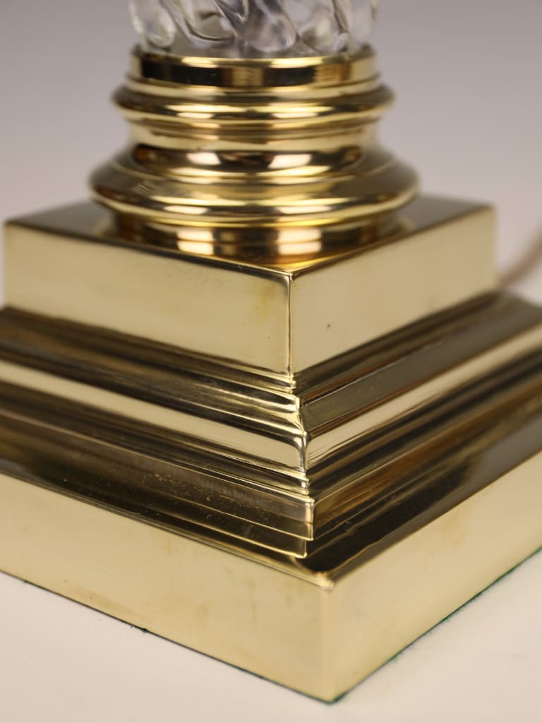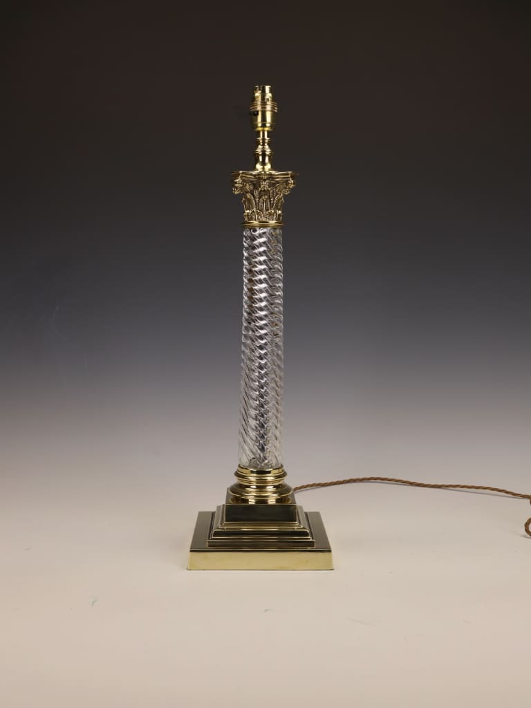 The spiral-ribbed glass column cut with impeccable precision catches and refracts the light beautifully, lending the piece a jewel-like quality even when unlit. The lamp is fitted with quality brass mountings throughout and retains a period-style cord.