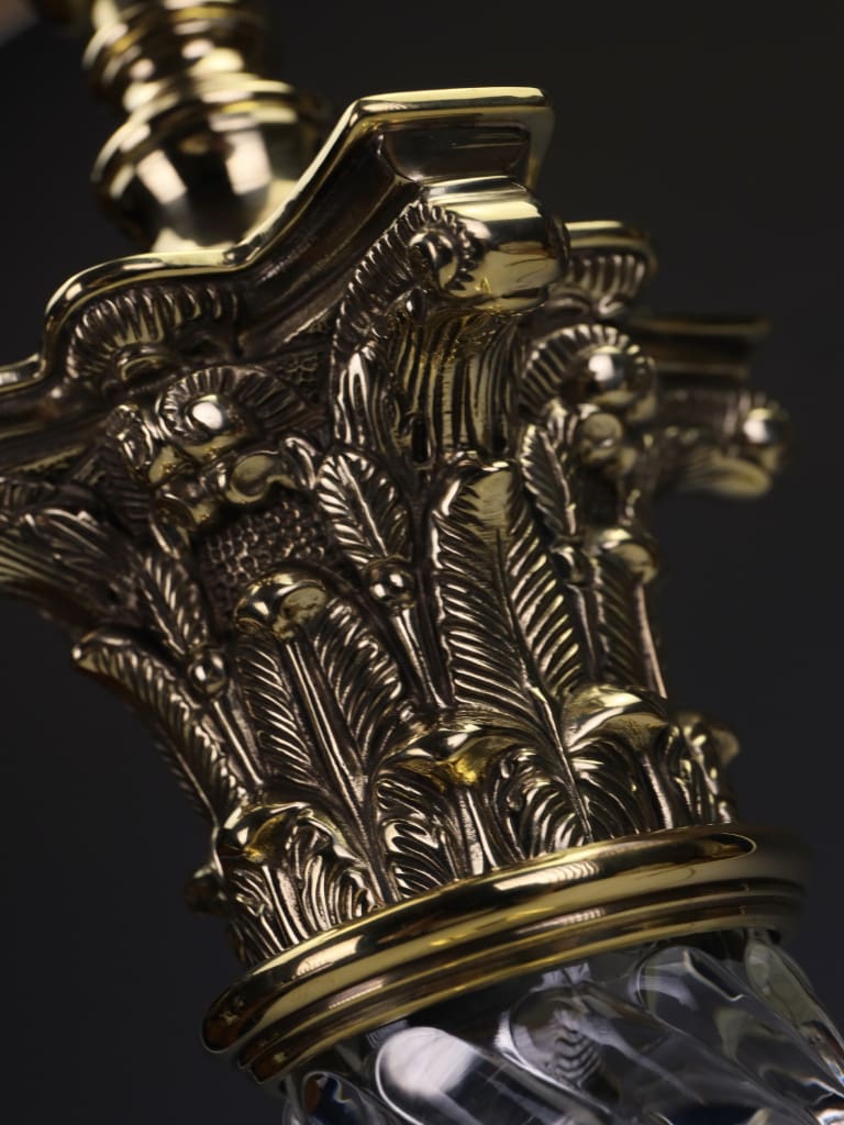 The upper capital is executed in the full Corinthian order, richly cast with acanthus leaves, volutes and crisp architectural detailing, all finished in a warm gilt brass. This decorative language echoes the neoclassical revival tastes embraced by leading English interior designers and lamp makers of the Edwardian period, who drew inspiration from ancient Greek and Roman architecture.