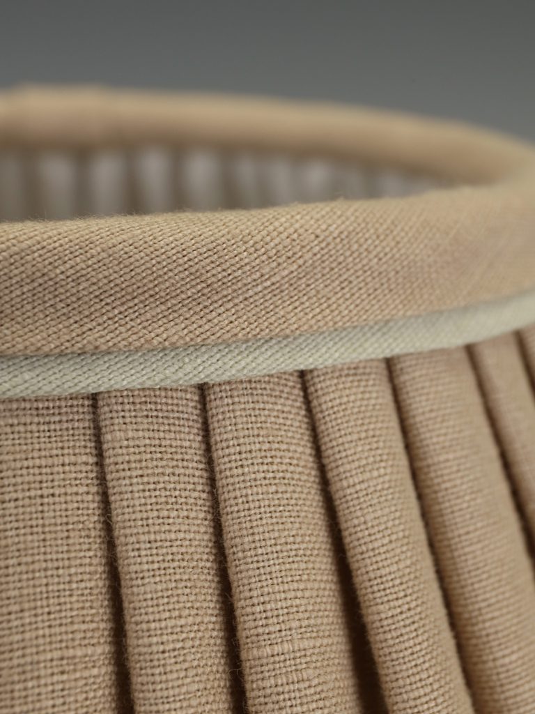 Individually handmade in the UK by skilled artisans, this shade features a textured Blush linen body that offers a gentle wash of colour without being overpowering. The rosy tones are beautifully grounded by a Natural linen trim at the crown and base, framing the classic flared silhouette with a subtle, earthy contrast. This palette is a superb choice for crowning polished brass, silver-plated column lamps, or delicate floral-painted ceramics.