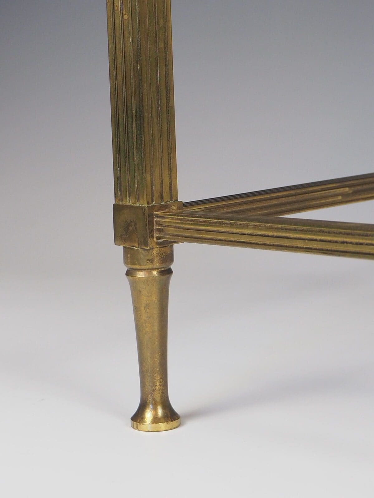 This table features a sleek, rectangular silhouette, enhanced by the lustrous brass frame that wraps around its perimeter. The rich brass finish adds a touch of warmth and luxury, making it a perfect addition to any contemporary or classic living space.
